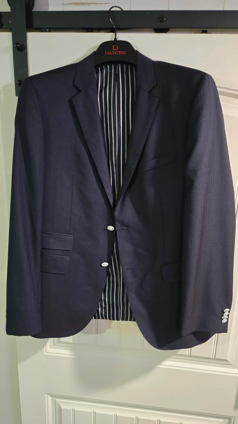 Here's a stylish navy blazer from Hugo Boss! It's in great condition and features a classic design with a striped lining. Perfect for adding a touch of sophistication to any outfit
