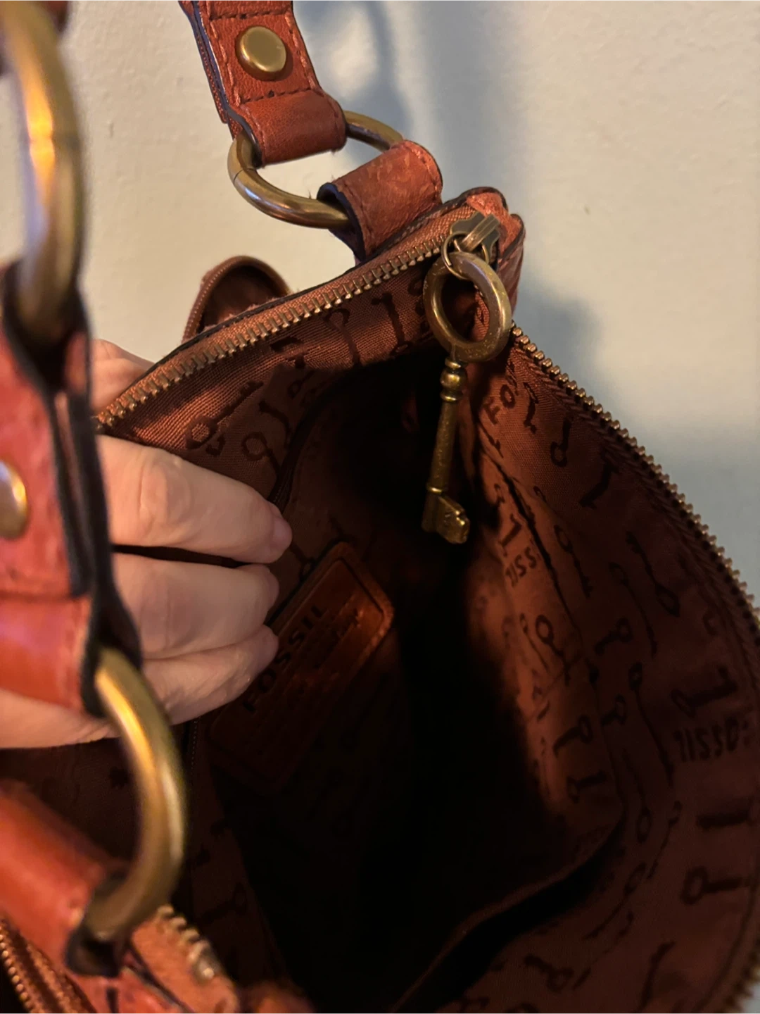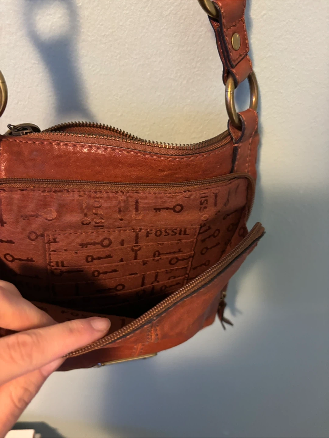This is a brown leather crossbody bag by Fossil. It features a main zippered compartment and an exterior snap pocket. The interior lining has a key and Fossil logo pattern.