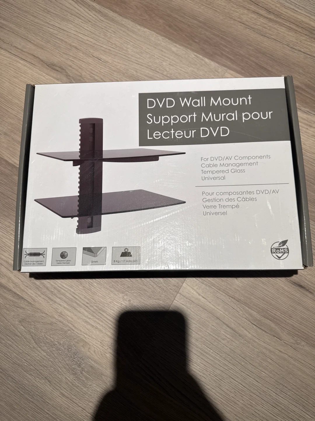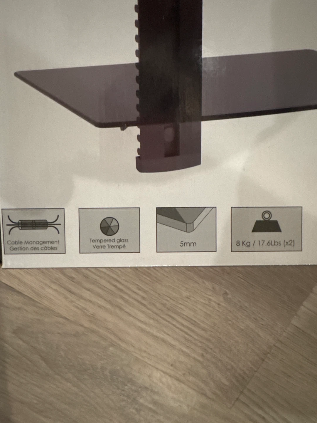 This DVD wall mount features tempered glass shelves and built-in cable management. Each shelf supports 8 kg / 17.6 lbs. It's universal and suitable for DVD/AV components.