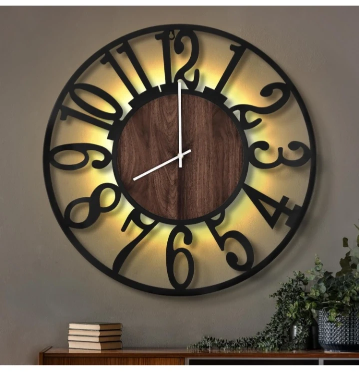 This wall clock features an intelligent photosensitive system that activates backlighting in the dark. It's voice-controlled, so lights turn on with sounds over 40 decibels. The clock has a wood-grain centre and a black metal frame with large numbers. It's great for adding ambiance to a room at night!