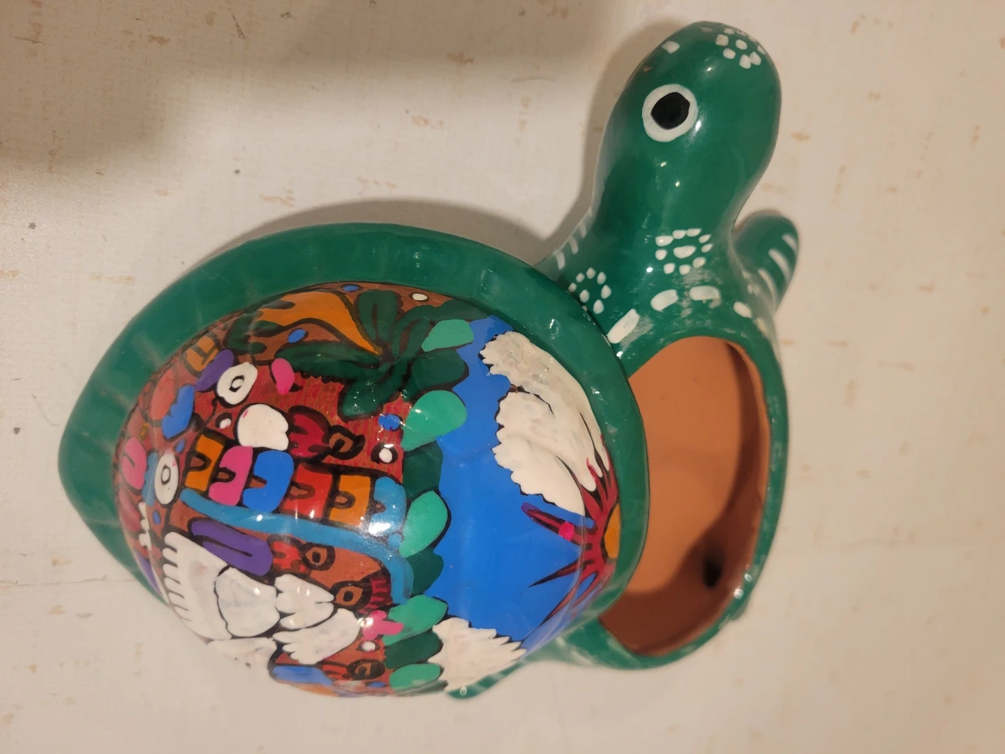 Large Hand Painted Mexican Terracotta Pottery Turtle Trinket Box