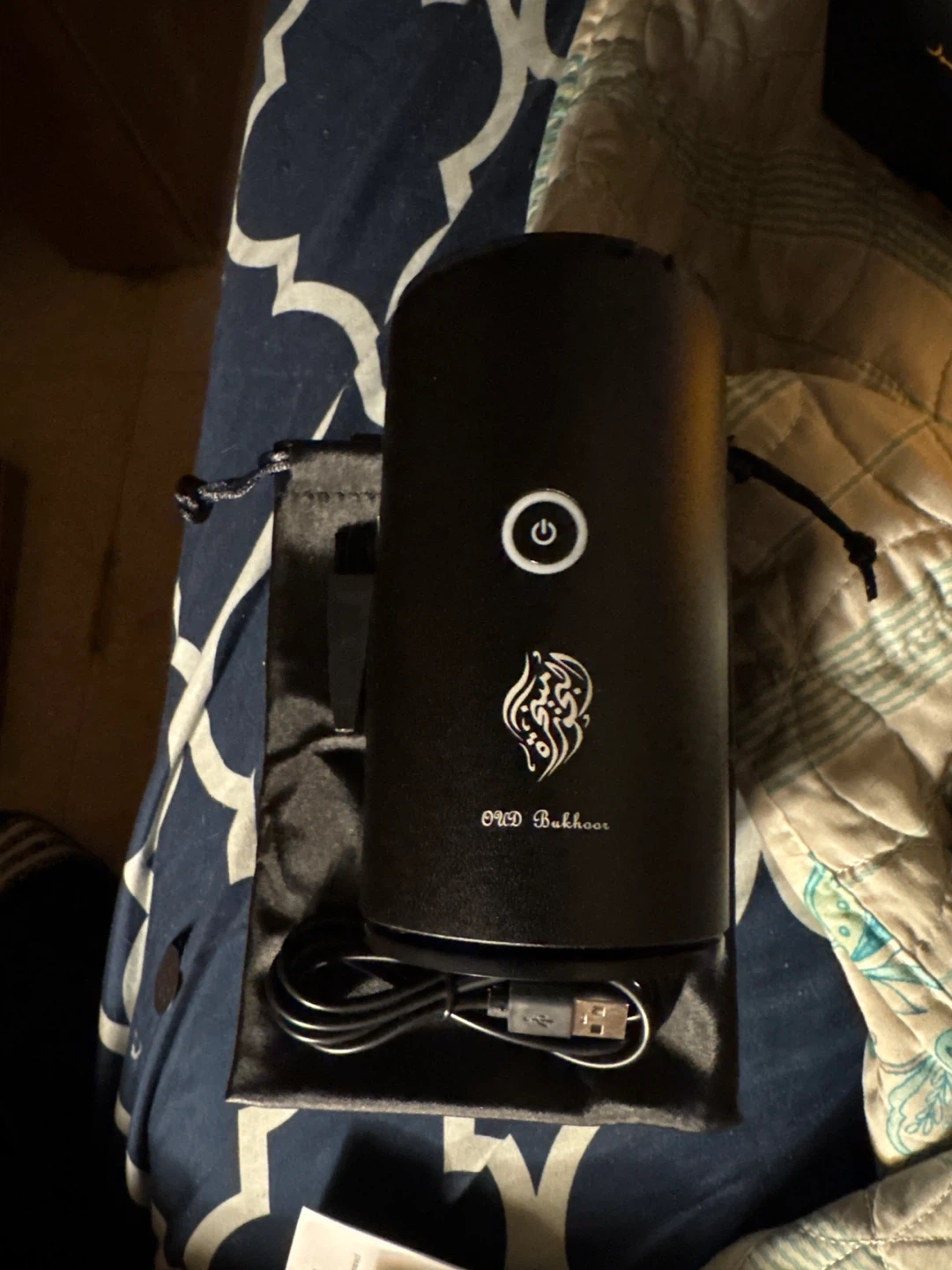 This electric incense burner is designed for Oud Bukhoor. It comes with a USB charging cable and a set of tools including tweezers, a scoop, and a brush, all housed in a storage pouch. It's great for creating a fragrant atmosphere at home or car.