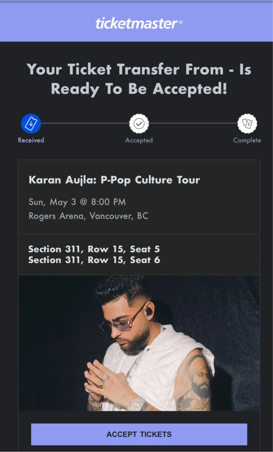 I’m selling 4 tickets for the Karan Aujla concert in Vancouver on May 3, 2026.