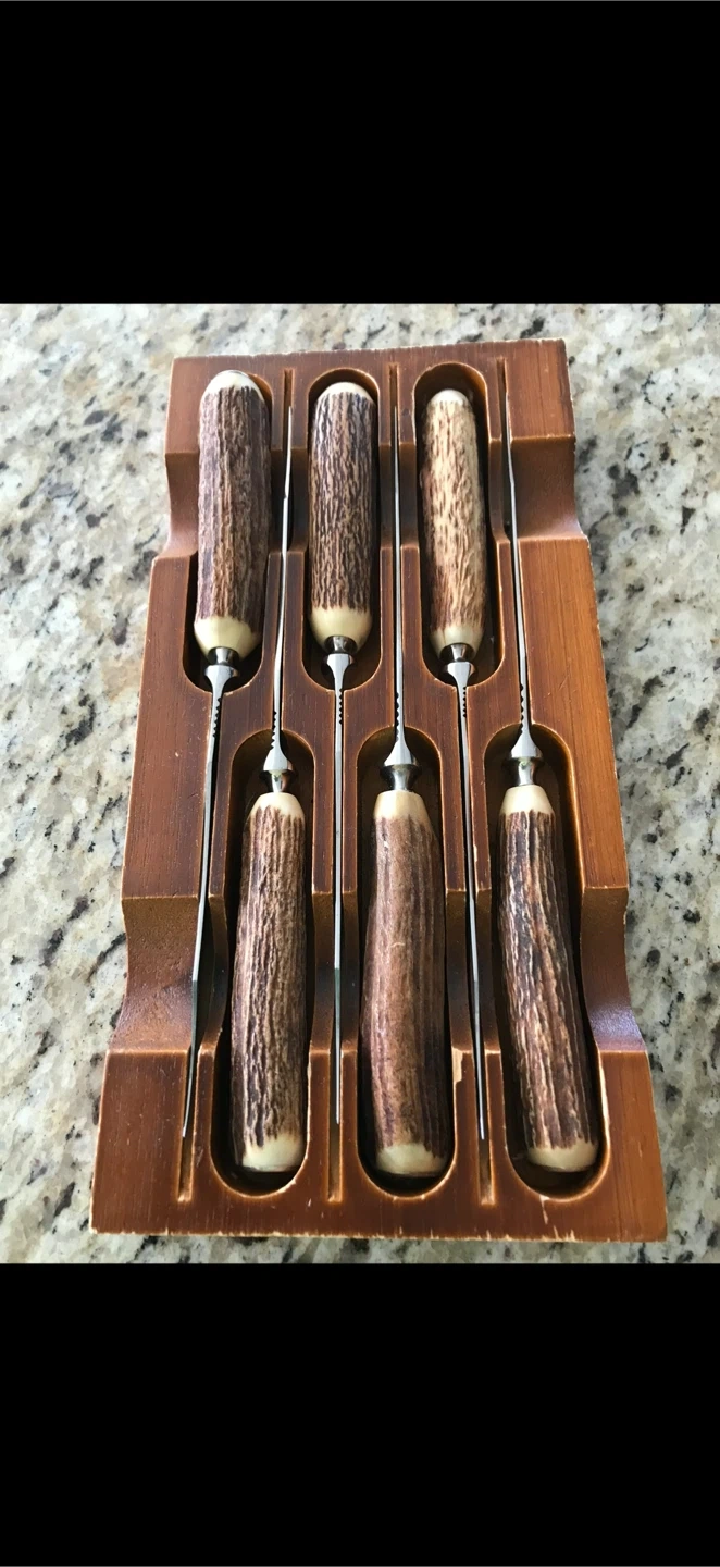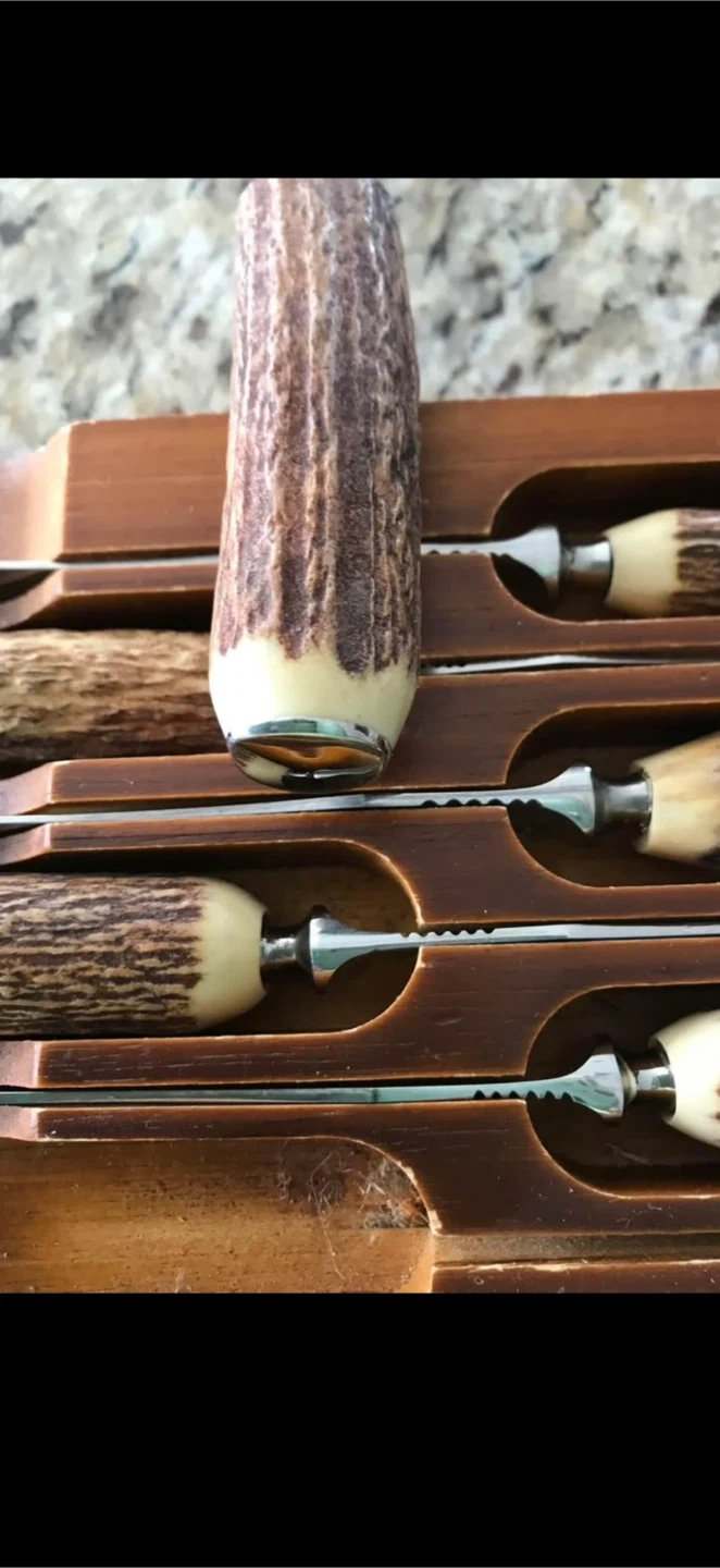 Set of six Birks knives made in Sheffield, England. Features genuine stag handles and stainless steel blades. Comes in a wooden display block. Excellent condition