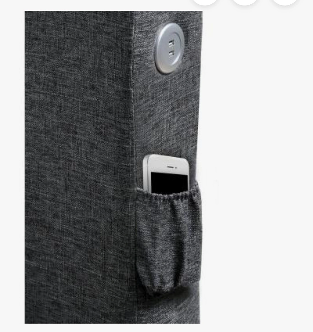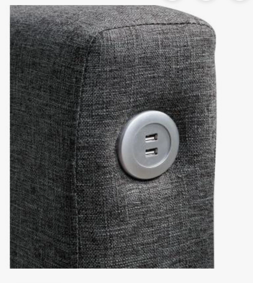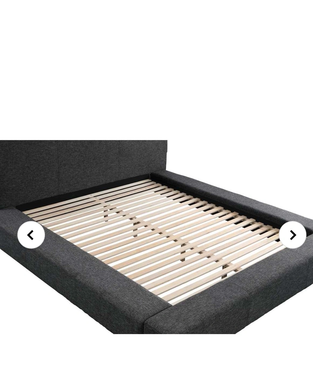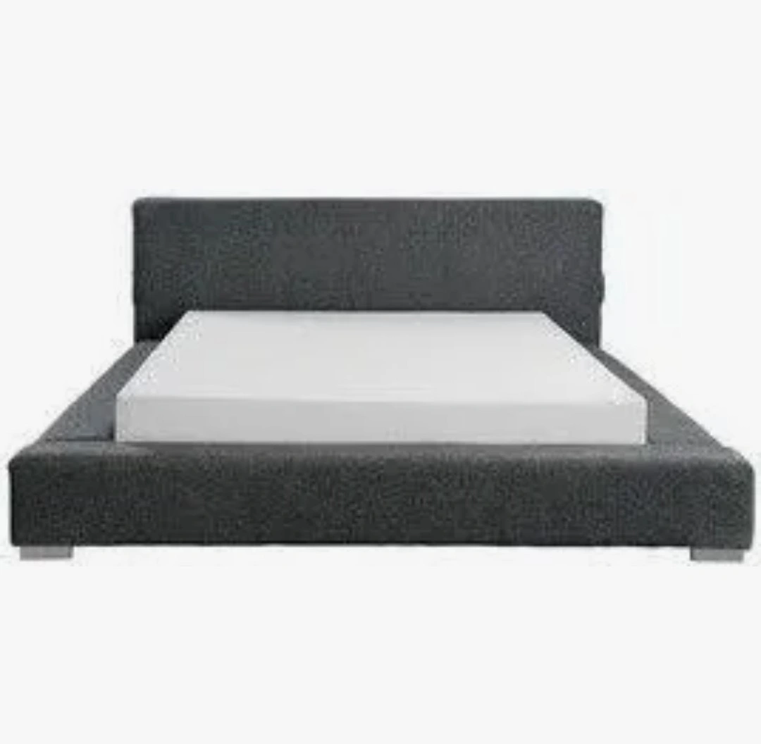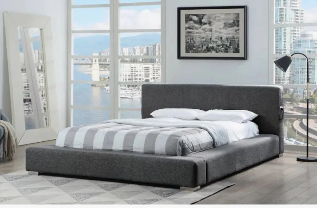 This platform bed frame is upholstered in a dark grey fabric. It features a modern design with a low profile and a padded headboard. Includes wooden slats for mattress support.also has charging ports and storage pockets on both sides of the headboard