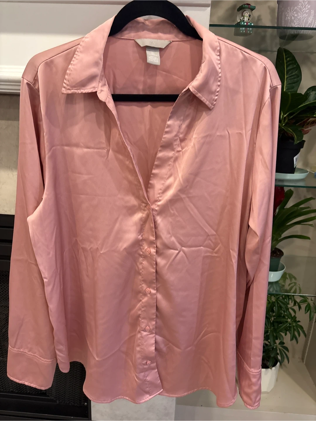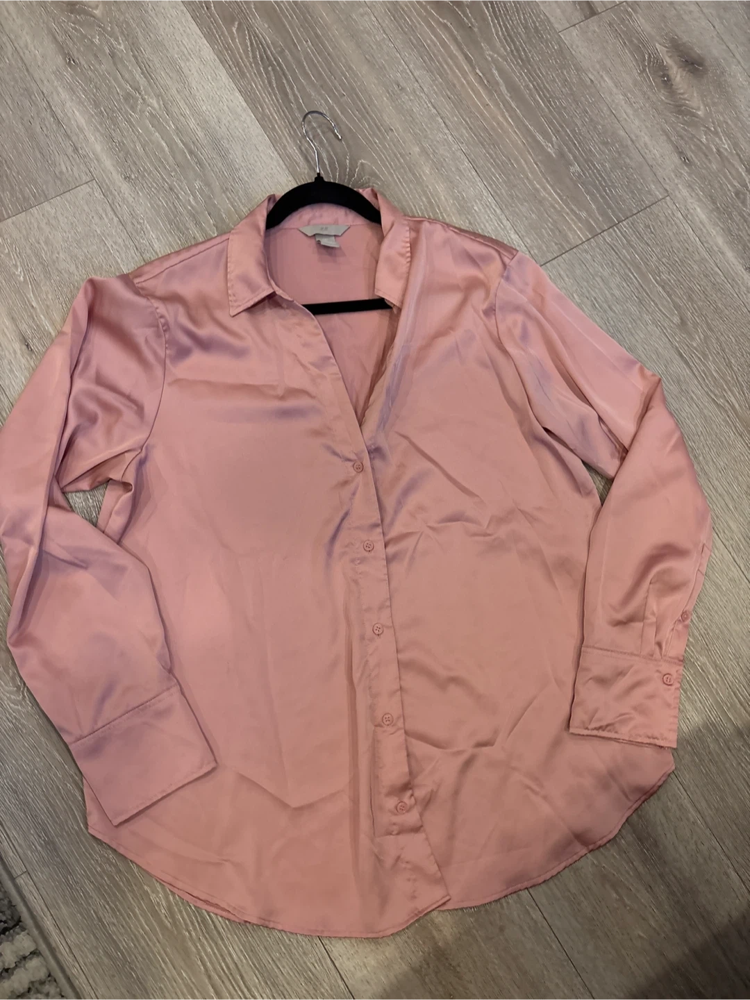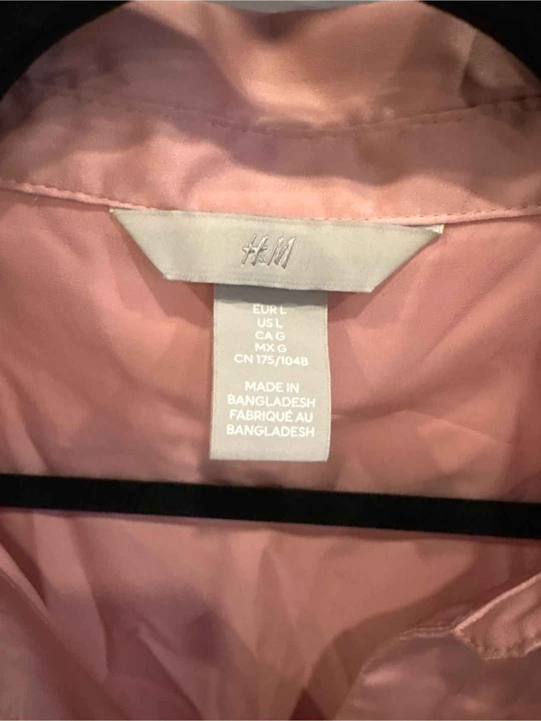This is a rose pink satin long-sleeve blouse from H&M. It's a size L, fitting EUR L, US L, and CAG L. It's made in Bangladesh from a smooth satin material that drapes nicely.