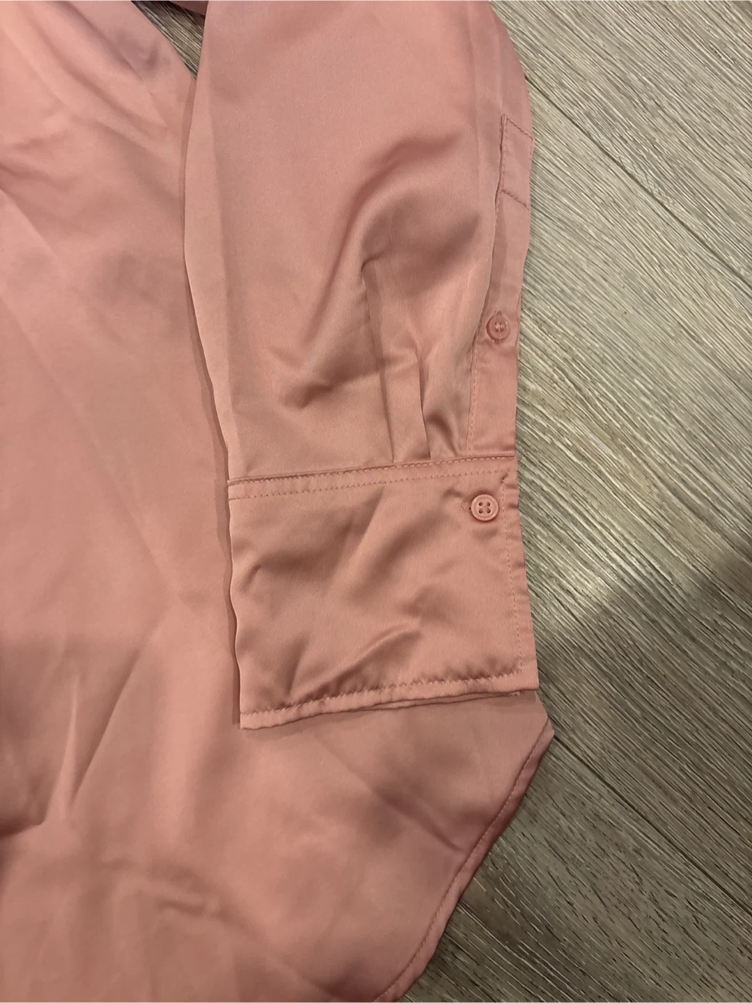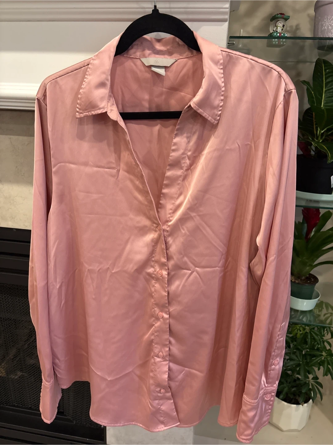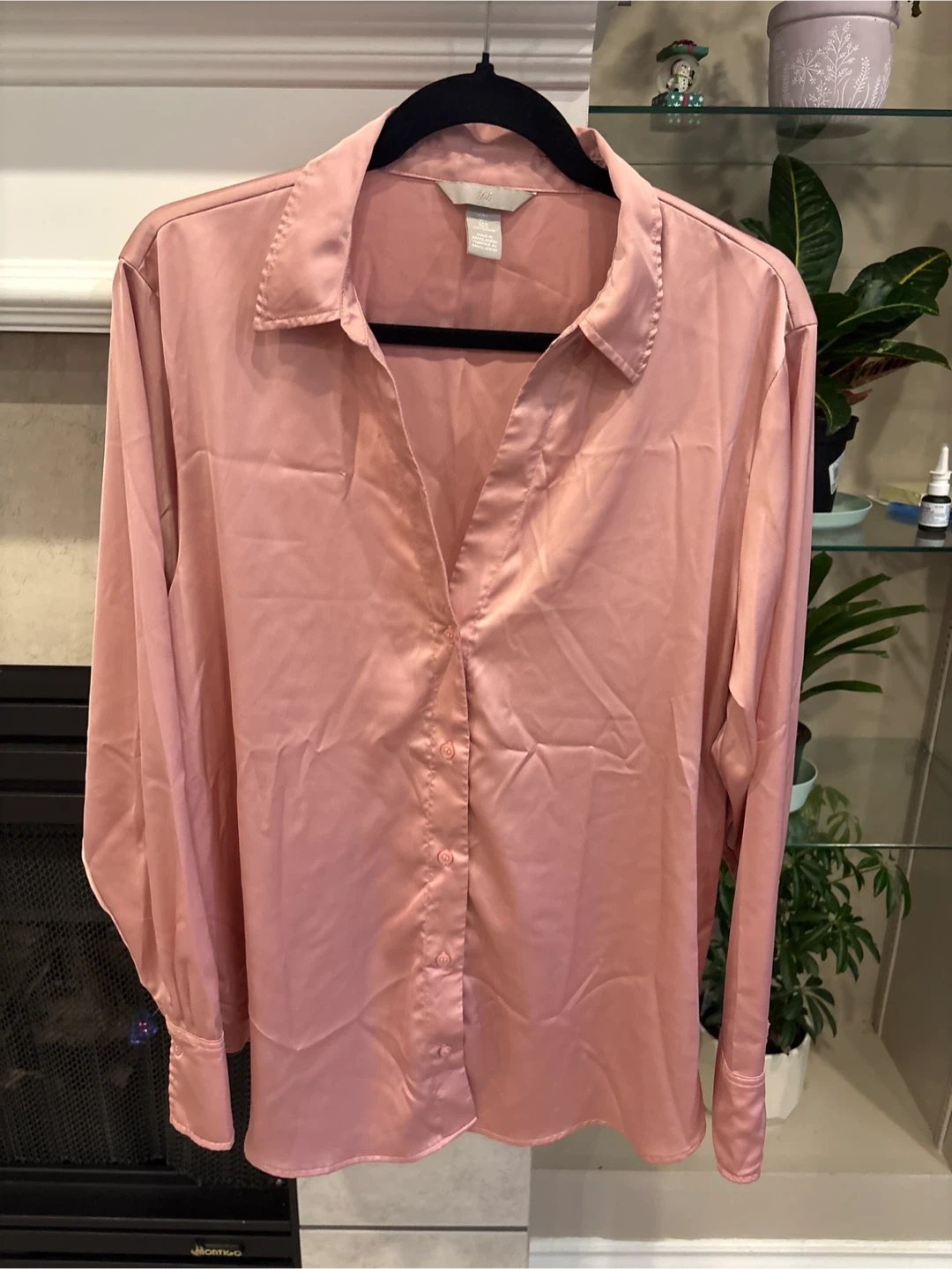 This is a rose pink satin long-sleeve blouse from H&M. It's a size L, fitting EUR L, US L, and CAG L. It's made in Bangladesh from a smooth satin material that drapes nicely.