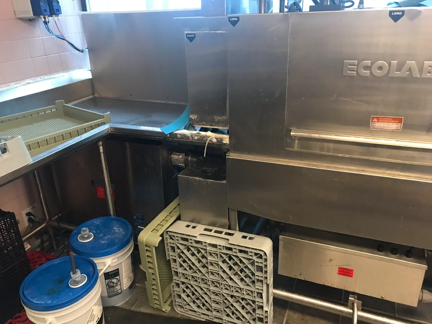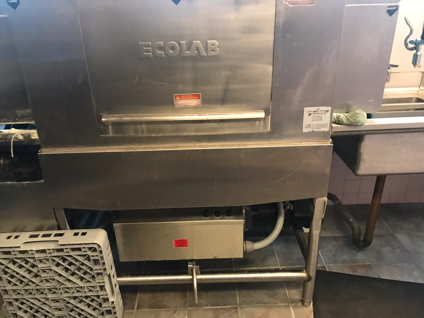 Commercial conveyor dishwasher from Ecolab. Stainless steel construction. Unit appears to be in good condition and ready for installation. Comes with multiple dish racks . As well as a gas power booster.
