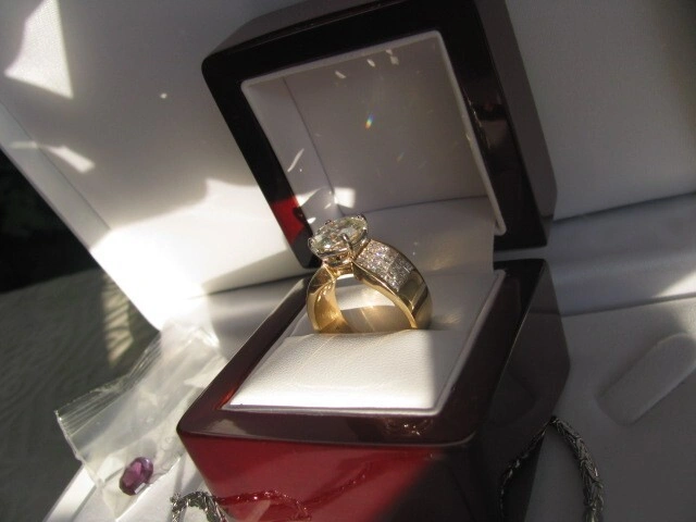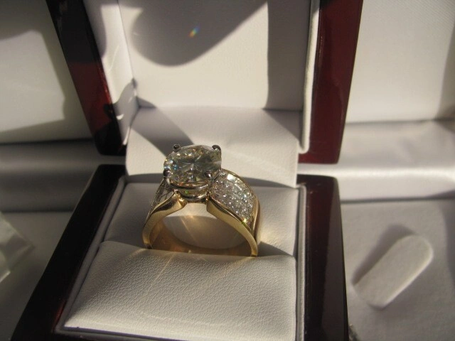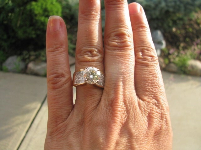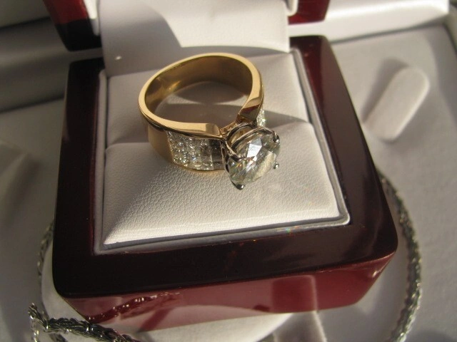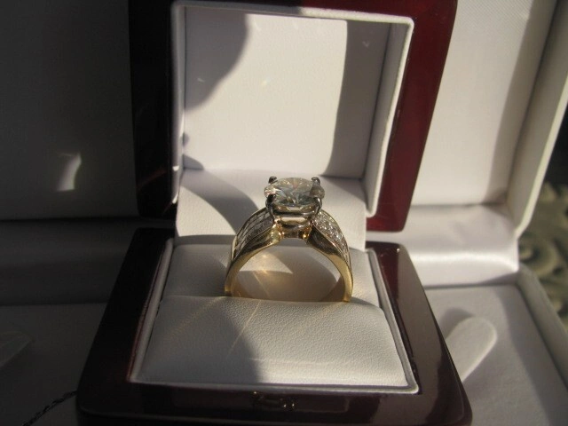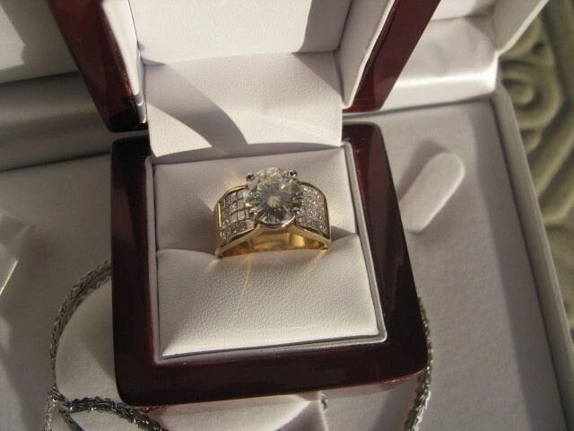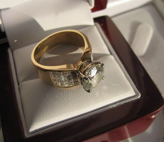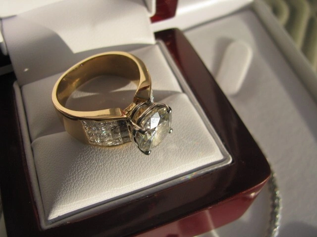 Estate ring, size 8.5. Features an 18k yellow gold band with a large 5.25 CT moissanite main stone and diamond accents. Main stone is white, metal is yellow gold.