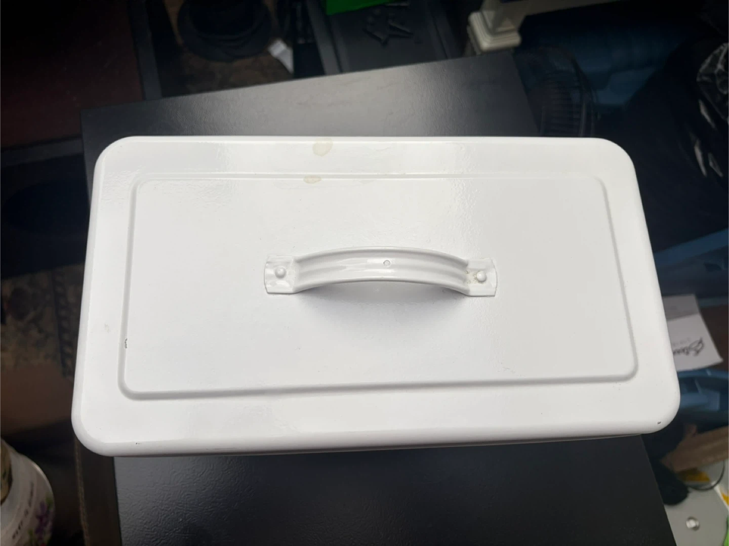 This is a white metal storage tin with a convenient handle. It features laundry care symbols on the side, indicating it's suitable for storing linens or laundry supplies. It's a durable option for keeping items organized.