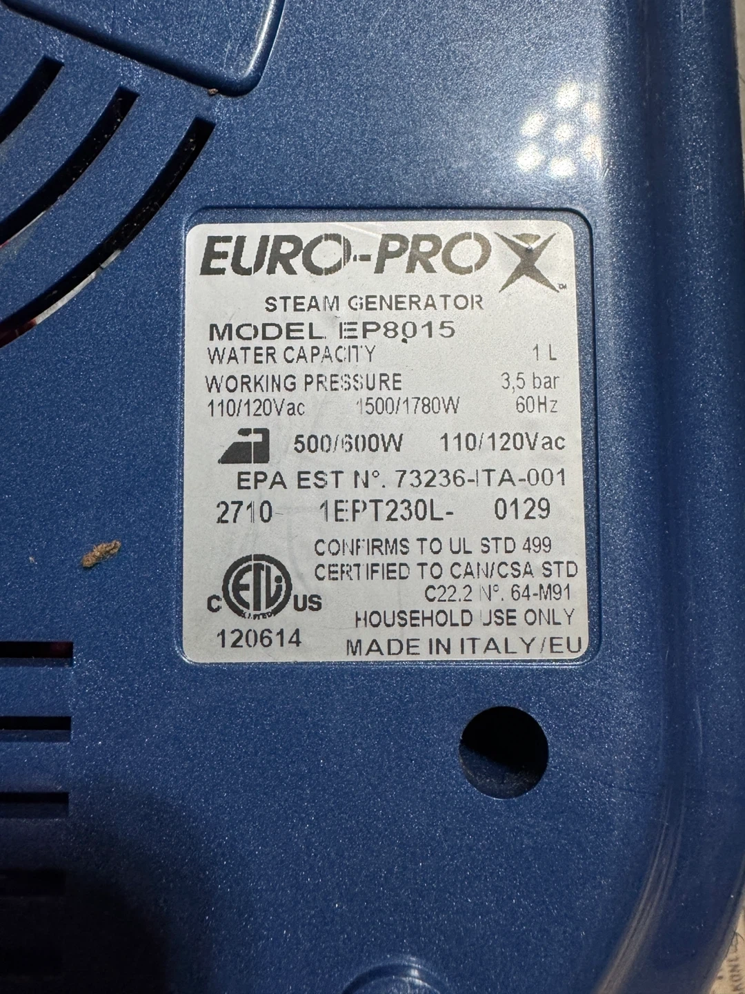 Euro-Pro X steam generator, model EP8015. Water capacity is 1 litre. Working pressure is 3.5 bar. Made in Italy/EU. Household use only.