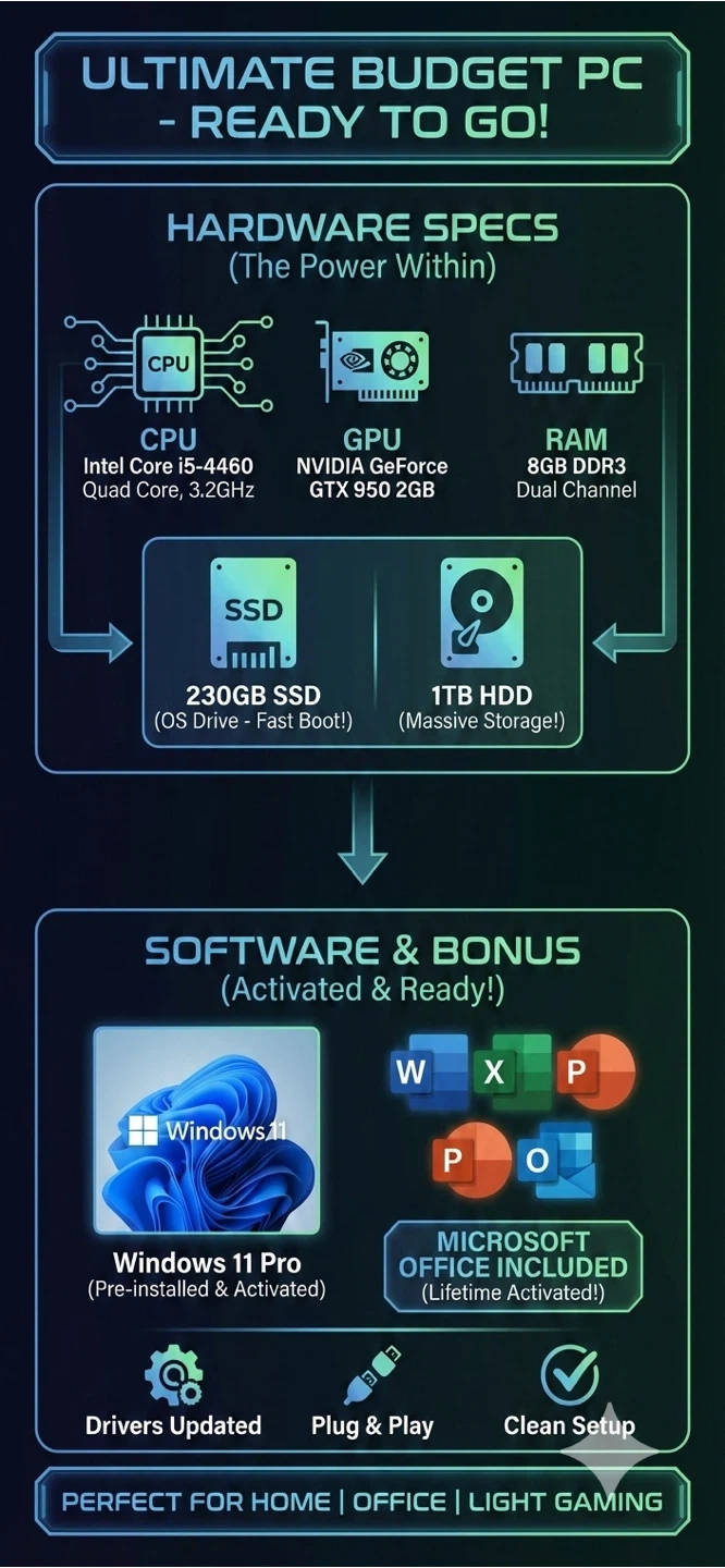 This is a budget-friendly desktop computer, ready to use. It's powered by an Intel Core i5-4460 Quad Core CPU, 8GB RAM, and a 230GB SSD with a 1TB HDD. Windows 11 Pro and Microsoft Office are pre-installed and activated for use. It's perfect for home, office, or light gaming.