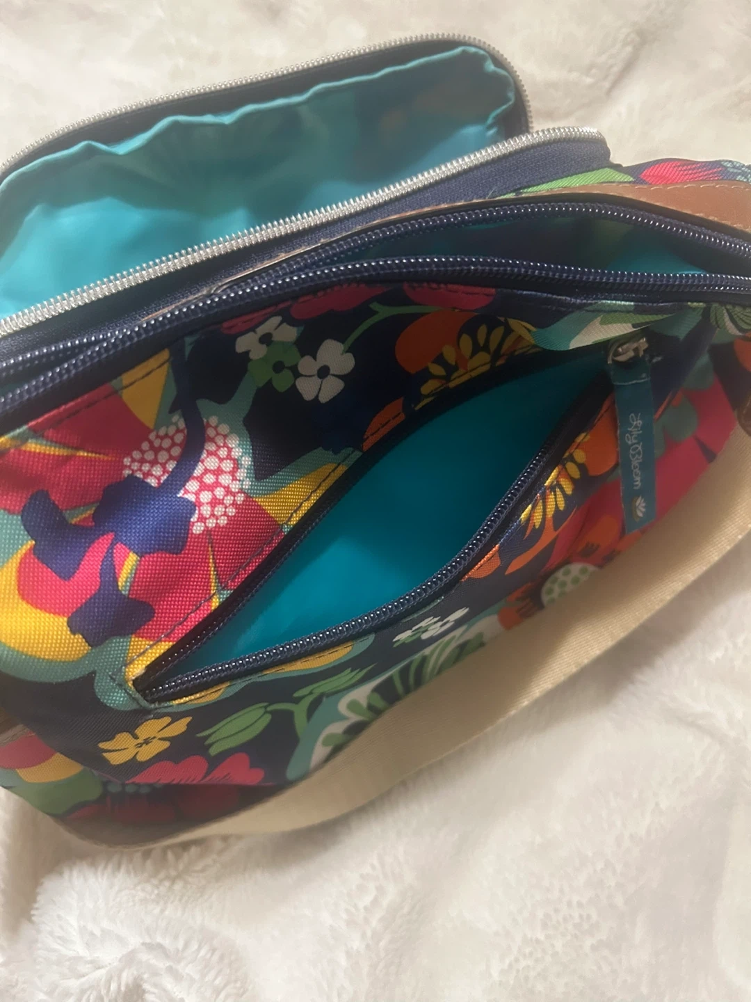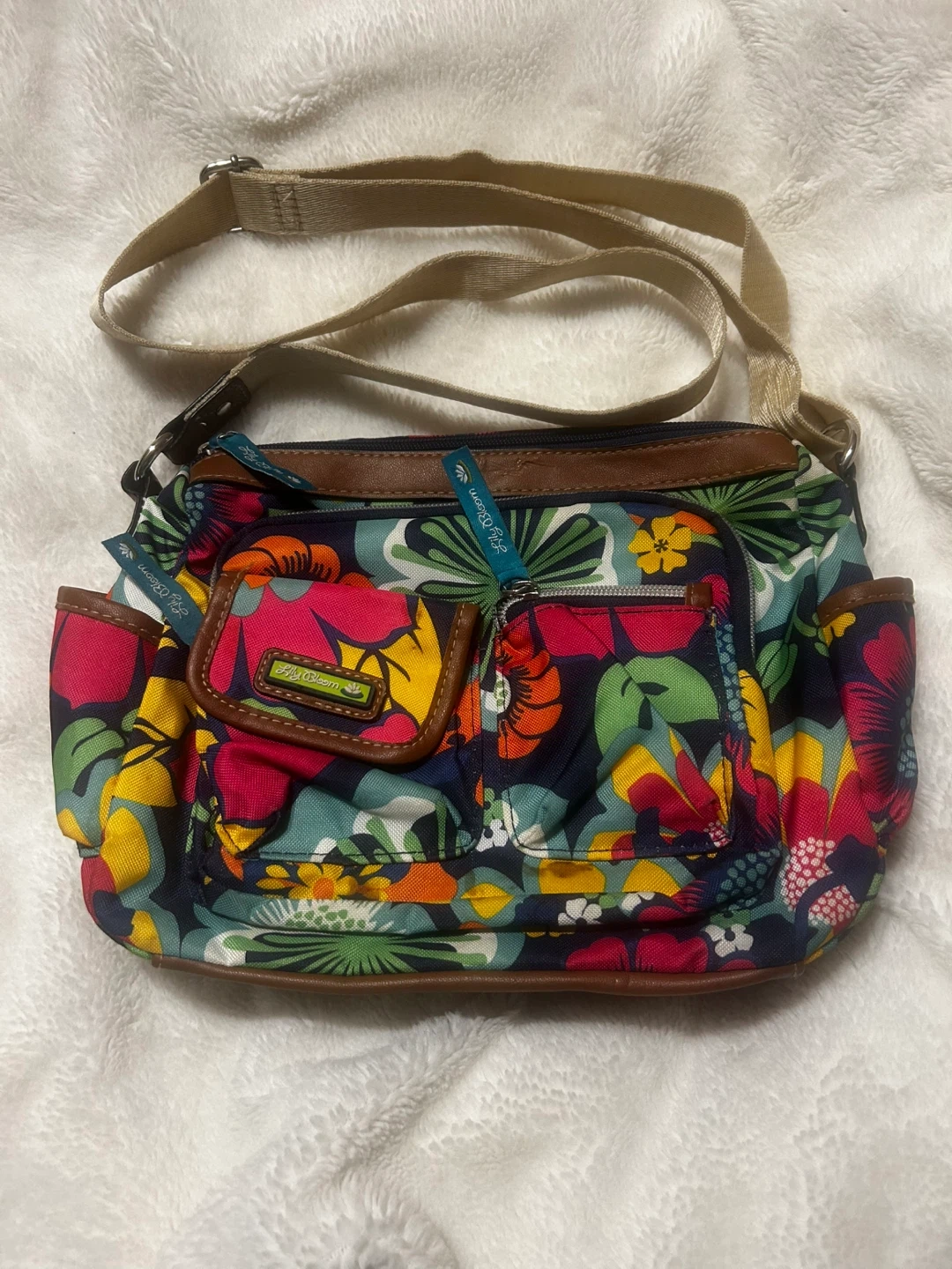 This colourful crossbody bag from Lily Bloom features a vibrant floral print. It has multiple exterior pockets and a zippered main compartment with a bright blue interior. The adjustable strap is made of tan canvas.