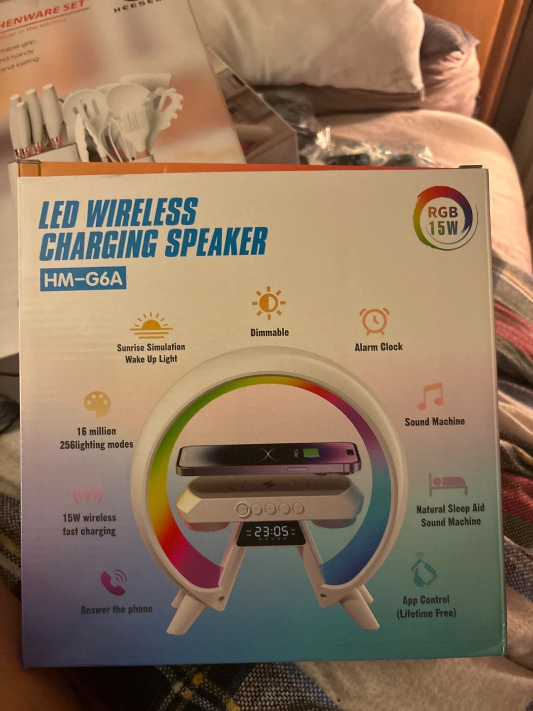 This LED wireless charging speaker features sunrise simulation wake-up light, 16 million colors, and 256 lighting modes. fast charging and doubles as an alarm clock and sound machine. Control it via app for a lifetime free experience! Wellington and Halsted here. Zelle or cash.
