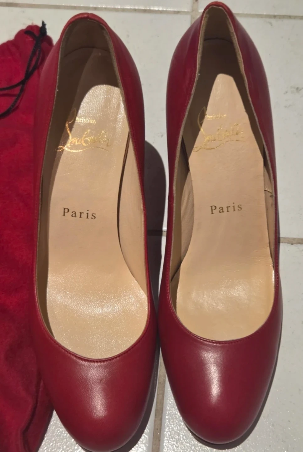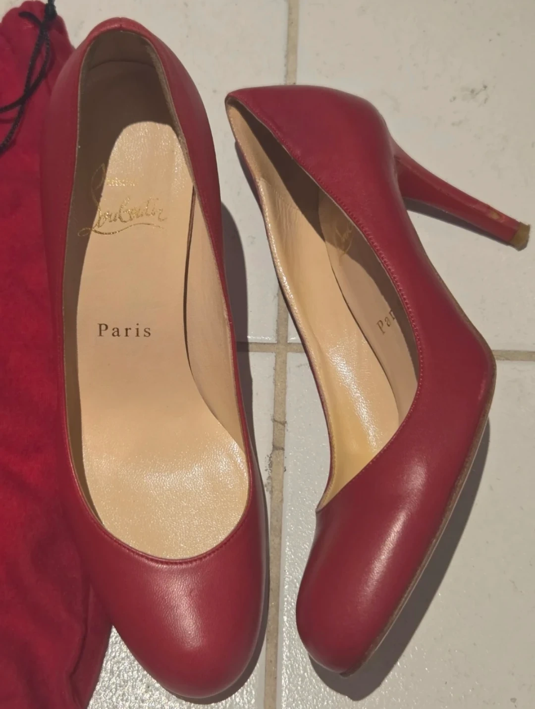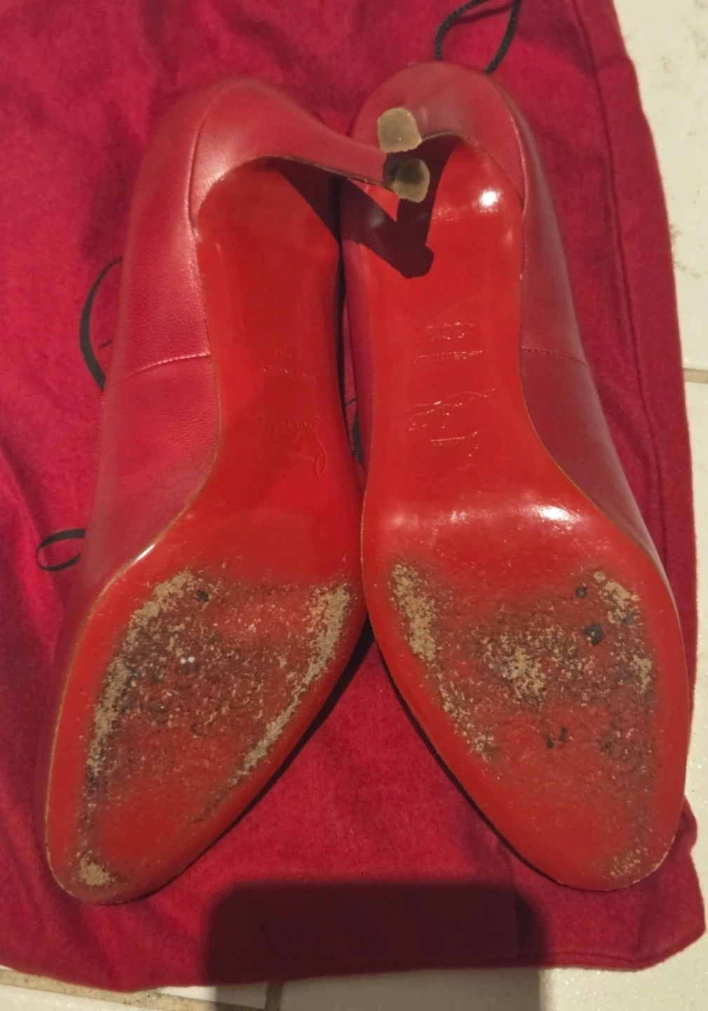 Classic red leather pumps from Christian Louboutin. Made in Italy. Almost new, only worn once. There’s a small scratch on the heel from the sidewalk, so I’m letting them go for a lower price. Great deal if you don’t mind the tiny mark! Size 6.