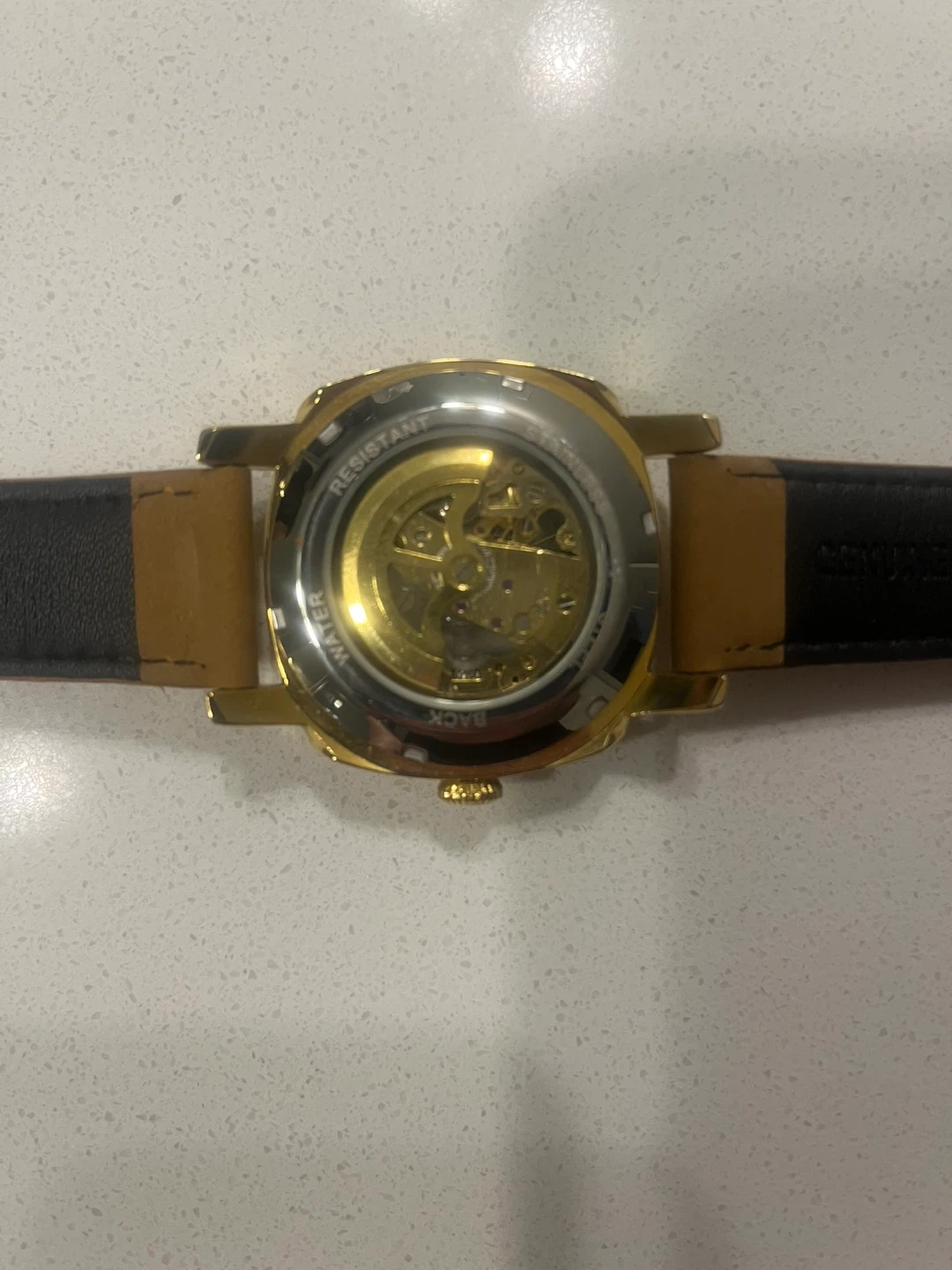 Forsining automatic skeleton watch with a gold-tone case and tan leather strap. It's a mechanical timepiece with a see-through case back. This watch has Roman numeral markers.