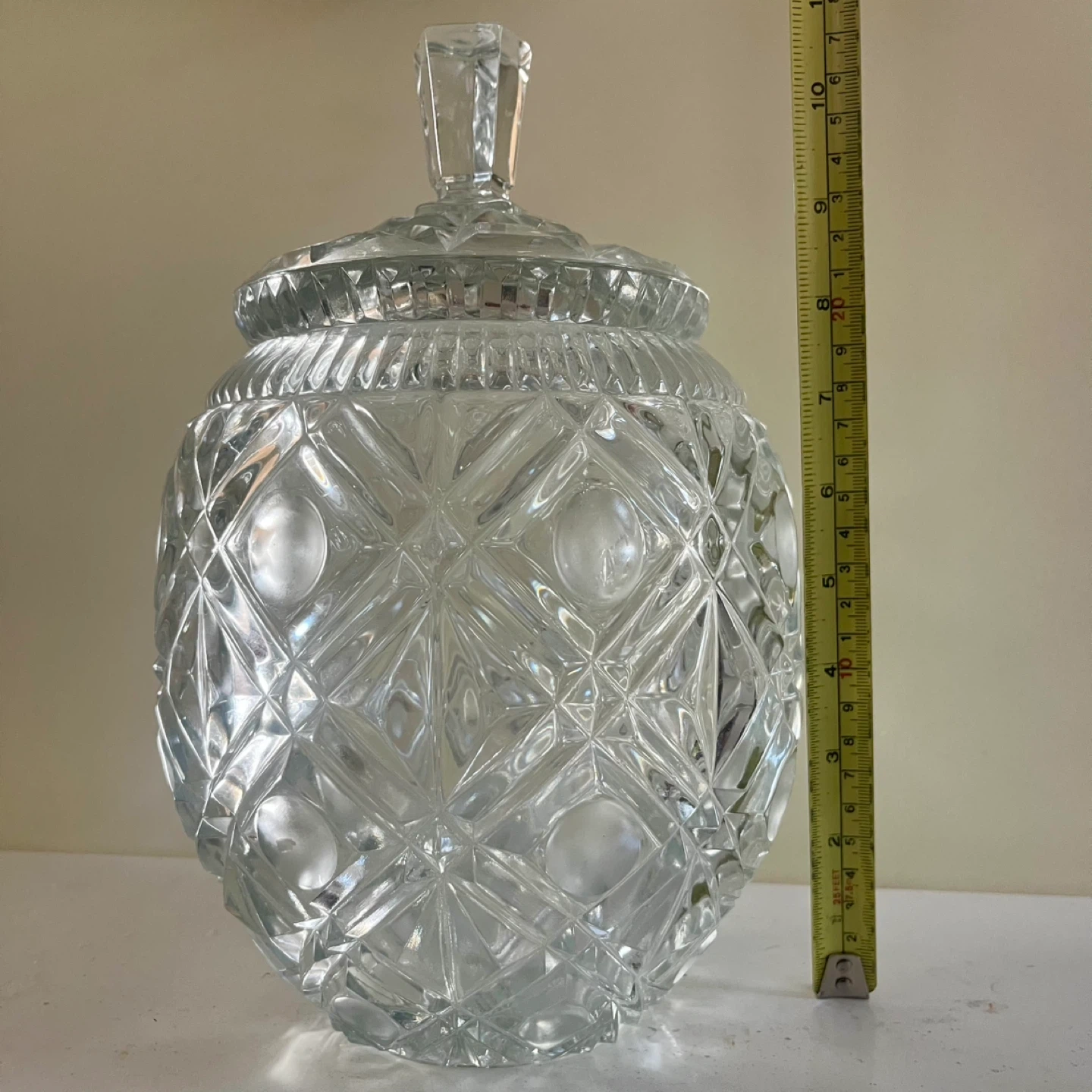 This vintage EAPG (Early American Pattern Glass) biscuit or cookie jar features an extra-large size and a stunning diamond thumbprint pattern. The intricate design is crafted from 24 lead crystal, complete with a matching lid. This is a used item in good vintage condition, with a couple of flea bites on the inner rim of the lid, not visible from the outside.