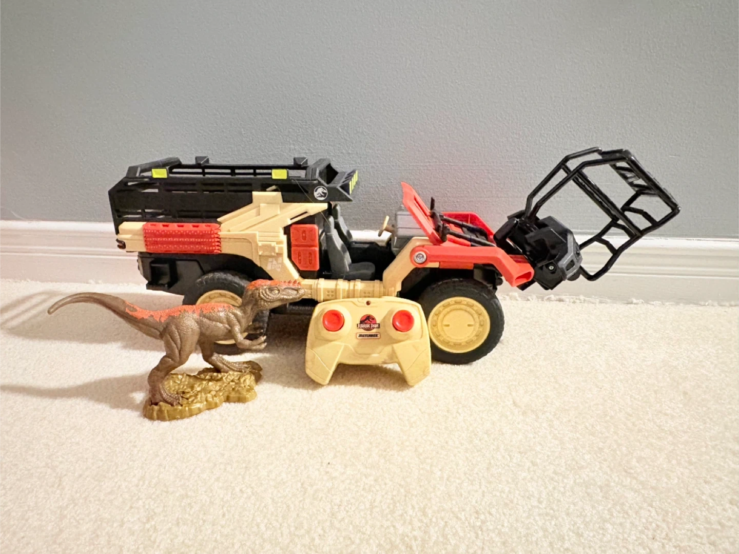 This remote-control Jurassic World toy truck comes with a dinosaur figure. It features a capture cage for transport. It's a fun toy for kids who love dinosaurs and RC vehicles! Pick up in the Yonge and finch area. Retails for $65+tax.