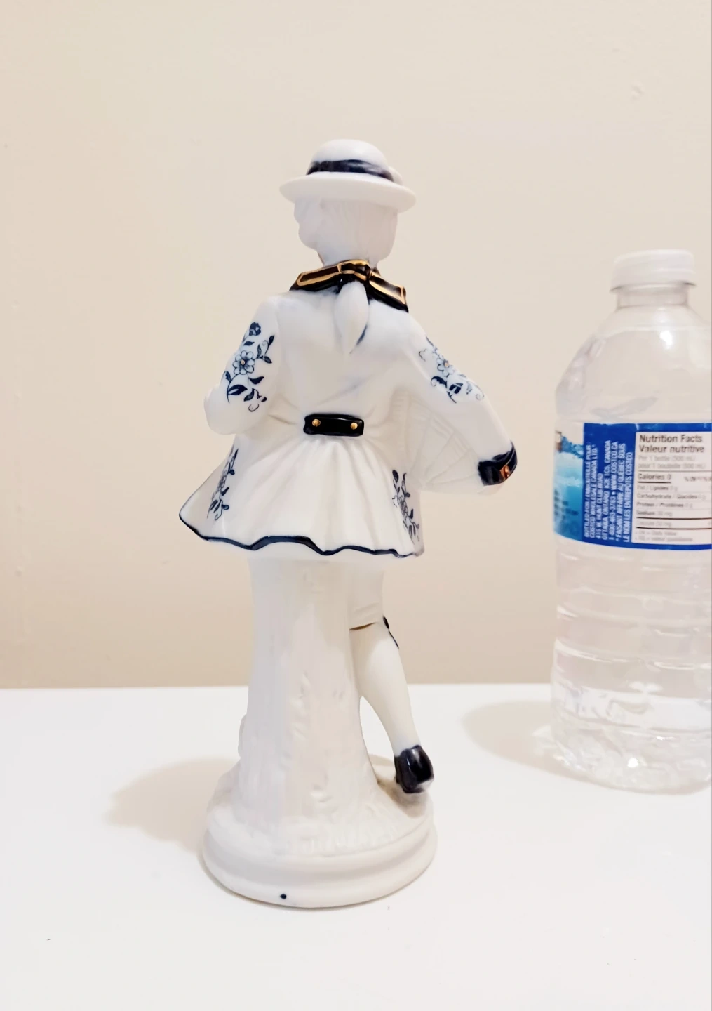 Vintage, Century Sales Inc. porcelain figurine of a man in 18th-century attire. It depicts a man in period attire holding a basket of fruit. The figurine features intricate blue floral detailing on the pants and coat. Standing 22 cm tall. This piece is marked with 'Creation Distinctive Century Sales Inc. Montreal' and a production number. Very Good Condition, with Sticker