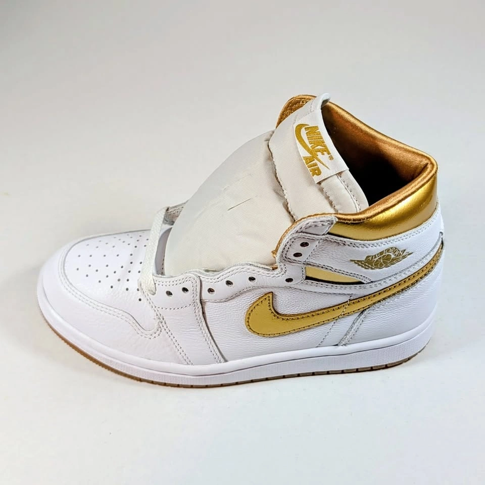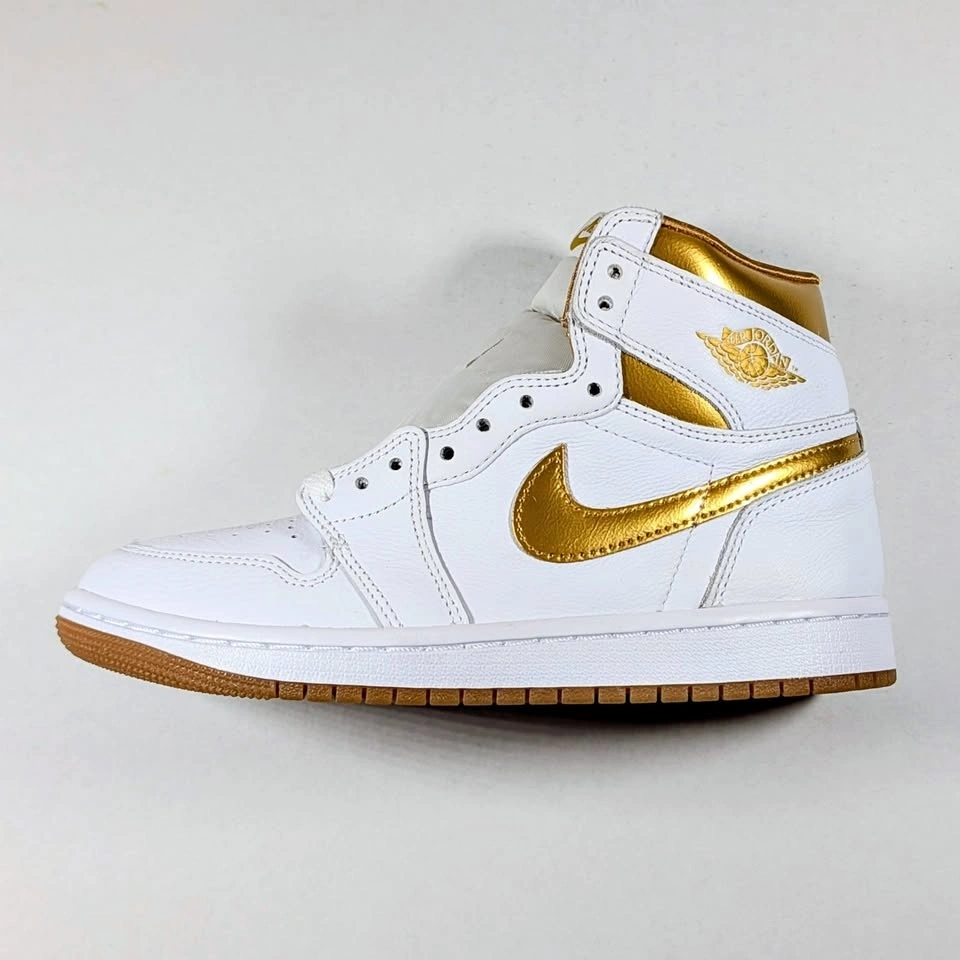 Jordan's iconic Air Jordan 1 Retro High OG sneakers are a gilded take on MJ’s first signature model. They’re crafted from pristine white leather with glossy gold accents and a detachable logo charm. The Wings and Swoosh logos are the same as the prototype.