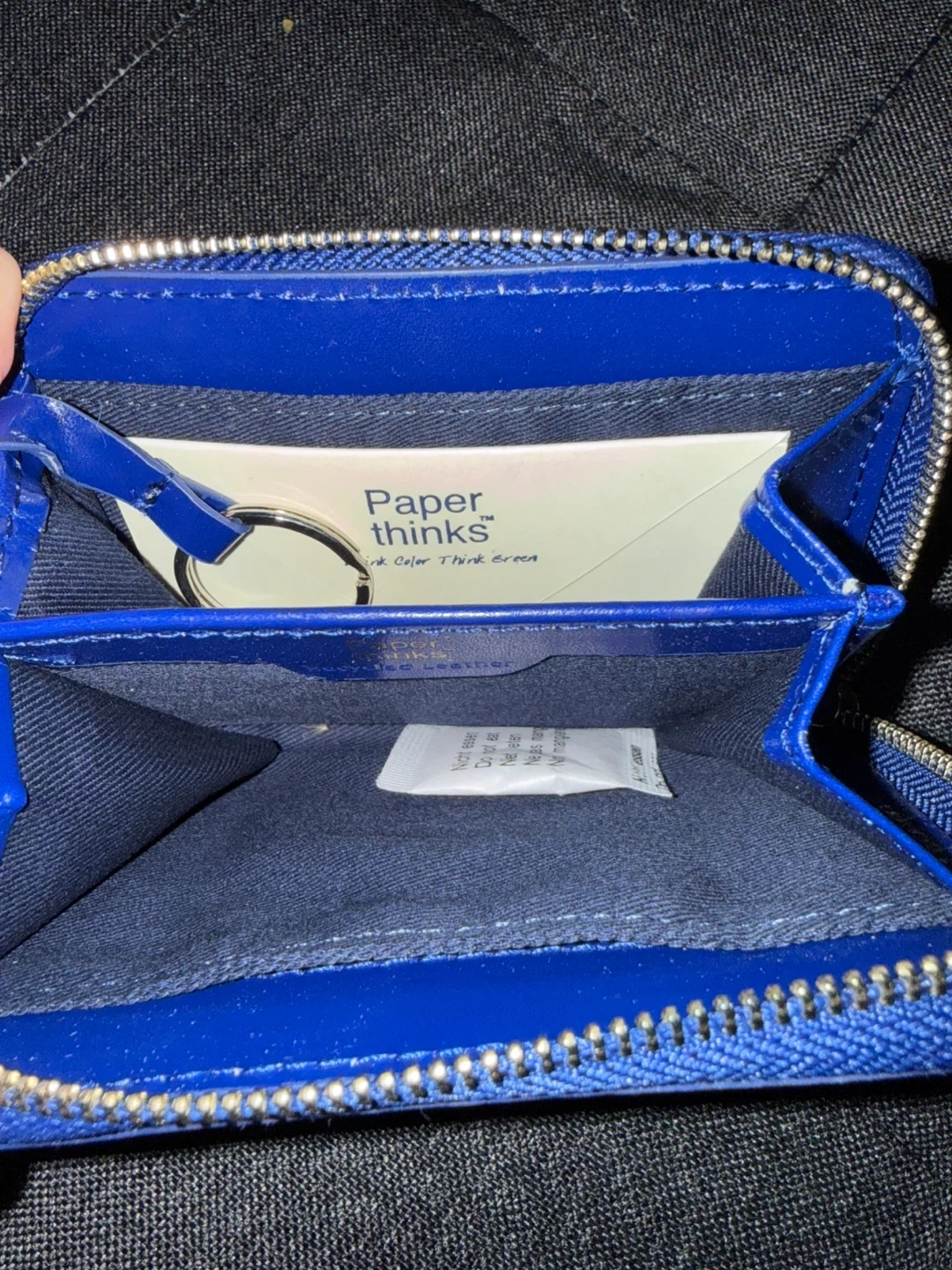 *New*. Beautiful blue zipped coin wallet with attached keying. Perfect for keeping your cards and cash organized!