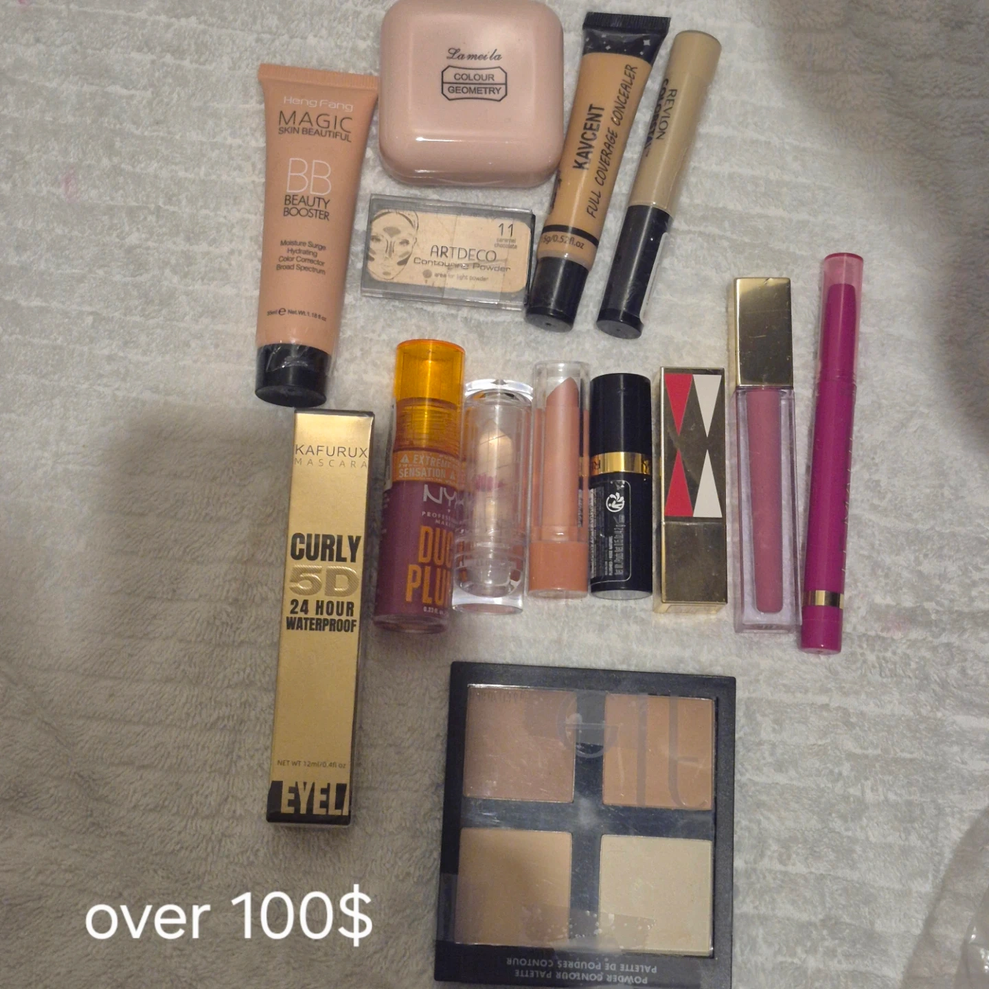 This makeup lot includes a Heng Fang BB Beauty Booster, a KAFURUX Curly 5D mascara, and various lipsticks and concealers. The BB cream is 35ml and hydrating. Mascara is 24-hour waterproof. Also includes ARTDECO concealer and a Revlon full coverage concealer. A La meila Colour Geometry compact is also part of this lot.14 brand new pieces, worth over 150$