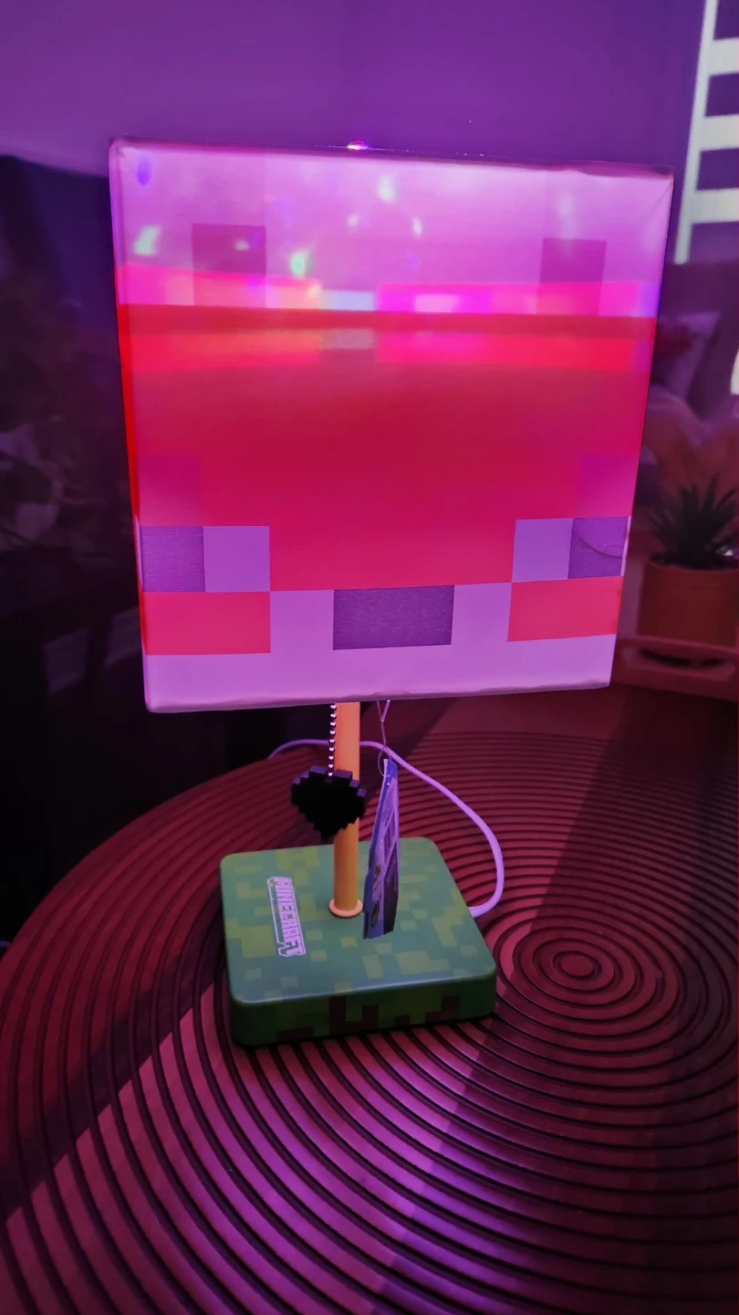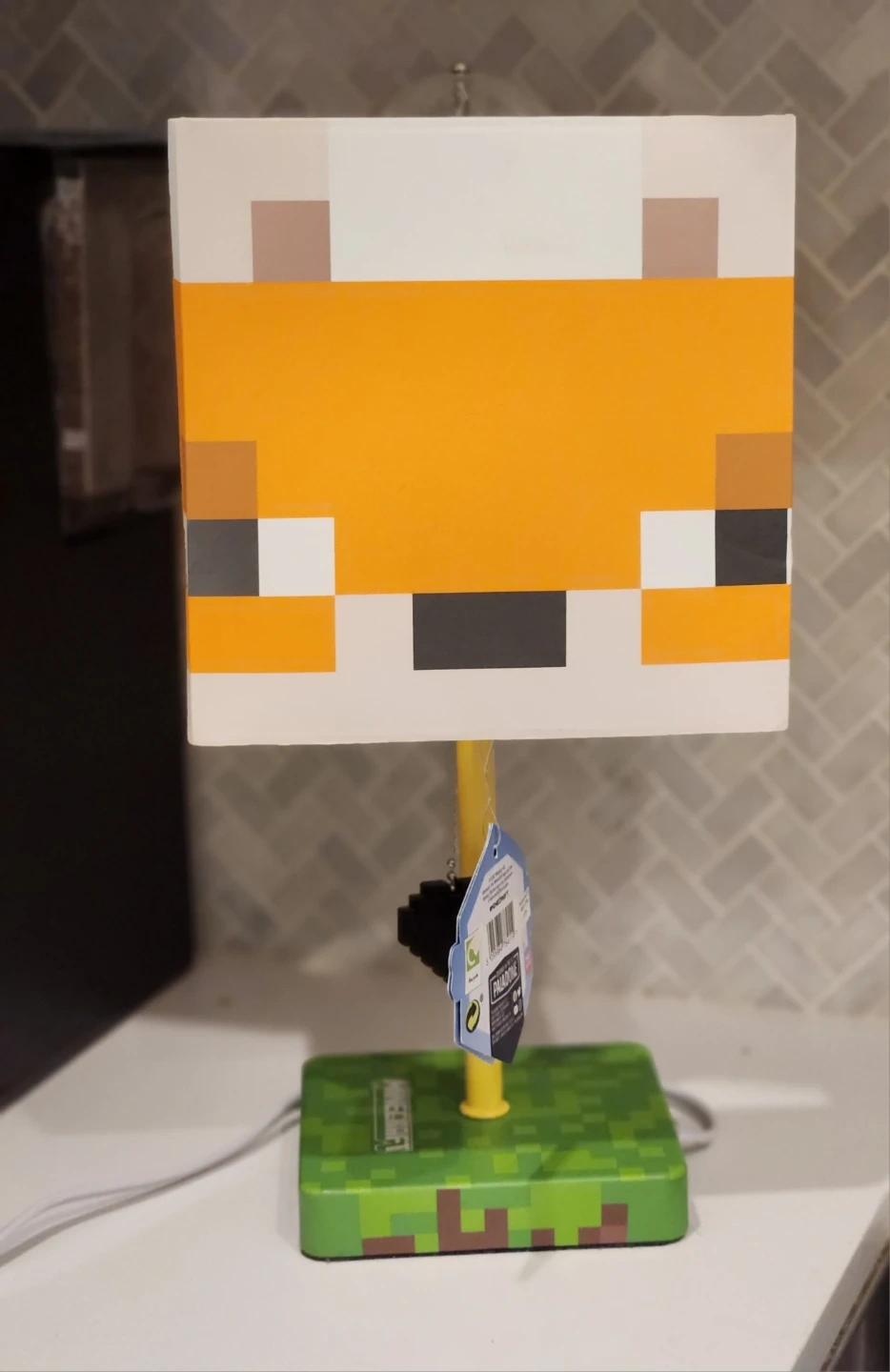 This Minecraft-themed table lamp features a pixelated fox design. It has a green, grass-block style base with the Minecraft logo. It's a fun addition to a gamer's room!