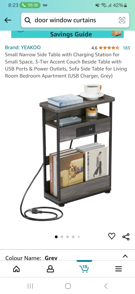 Grey side table. Three tiers, USB ports and power outlets. Narrow design, ideal for small spaces. Charging station included.