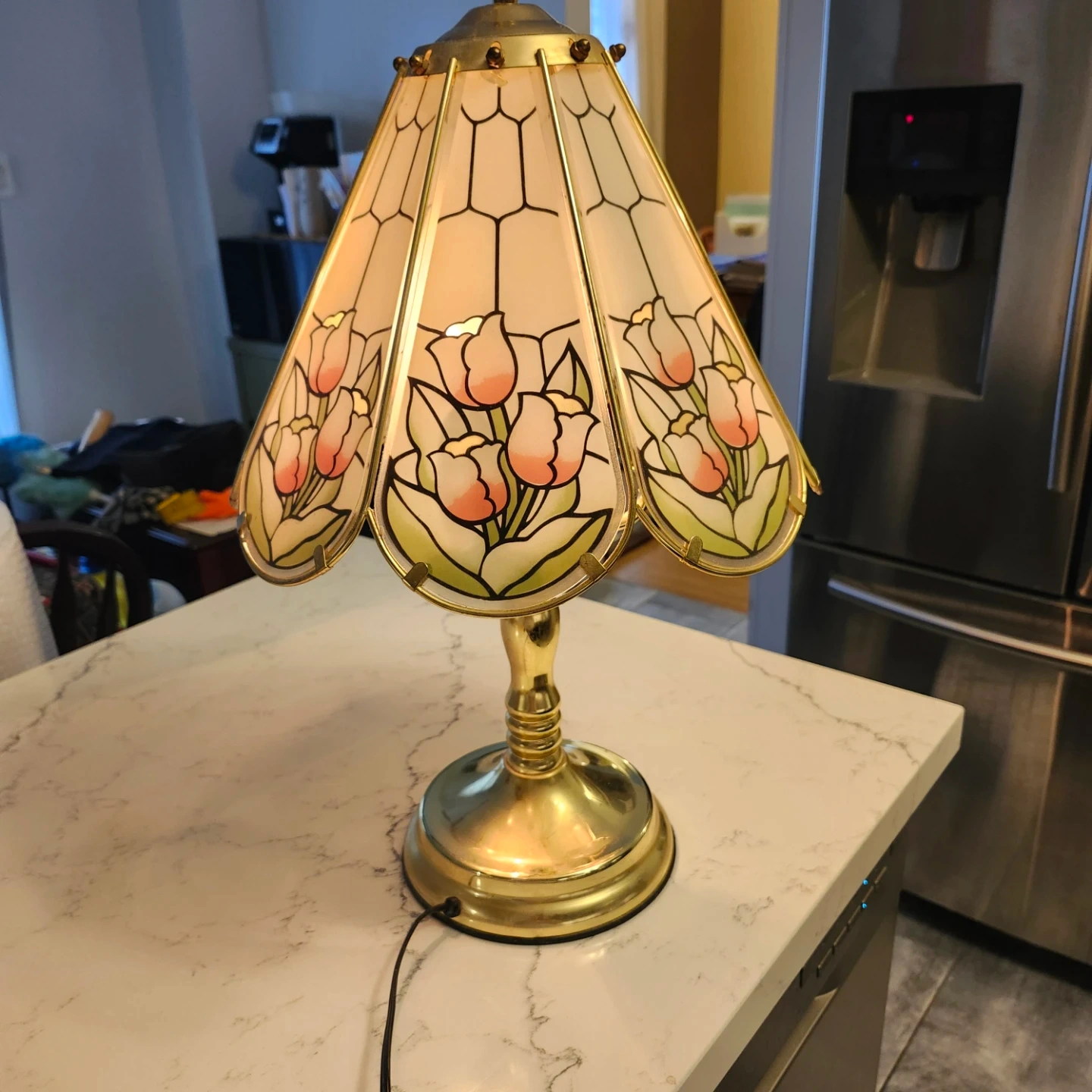 This accent lamp features a stained glass shade with a lovely tulip design. 3 phase touch light. The base is made of polished brass. It's perfect for adding a warm glow to any room.