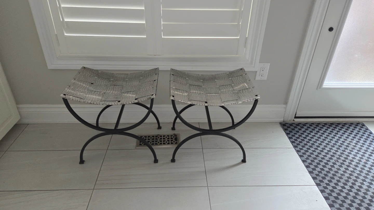 Two stylish ottomans with a woven silver-toned seat and black metal scroll legs. They're perfect for adding a decorative touch to any room or as extra seating. The woven material appears to be a synthetic leather or vinyl.