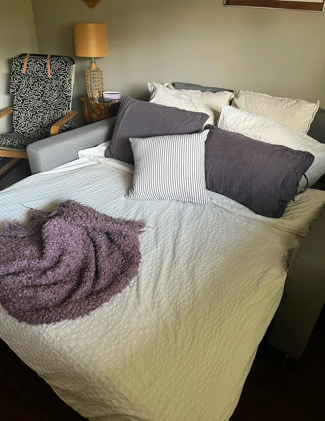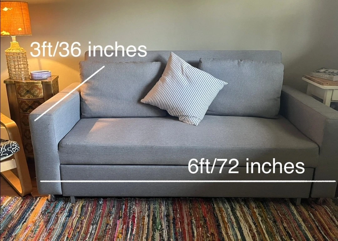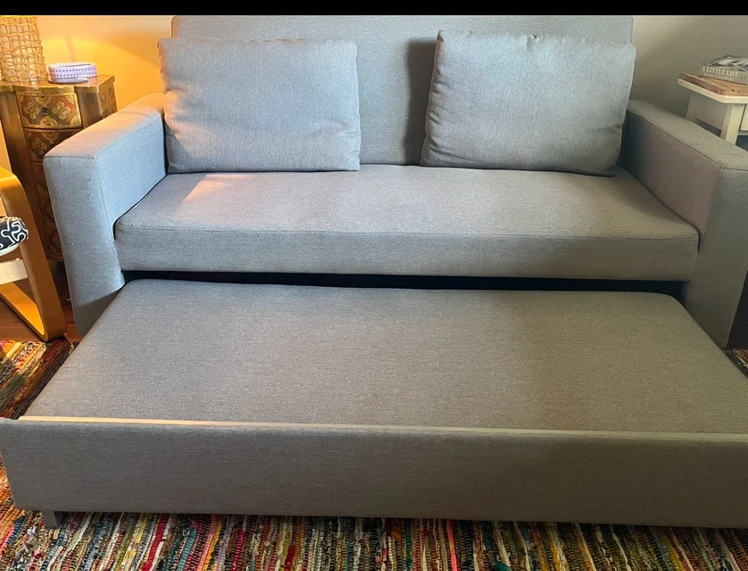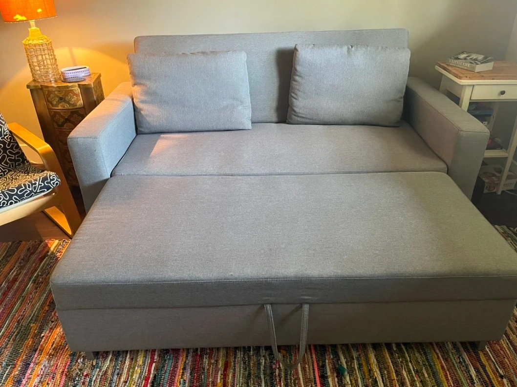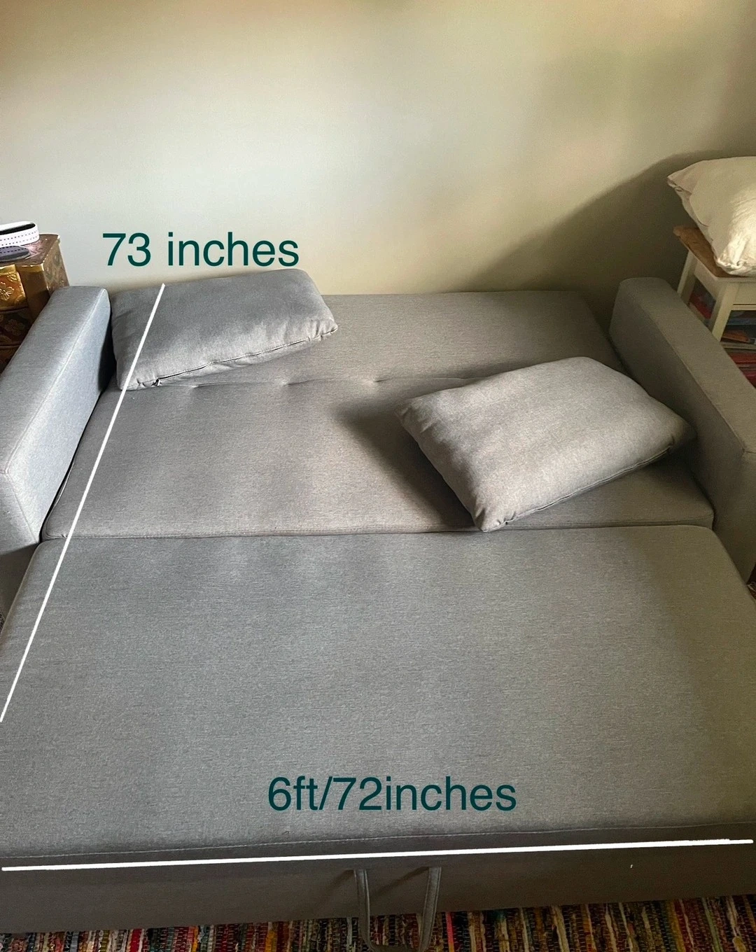 This grey sofa converts into a bed, offering a convenient sleeping solution. Comes with 2 grey throw pillows.
