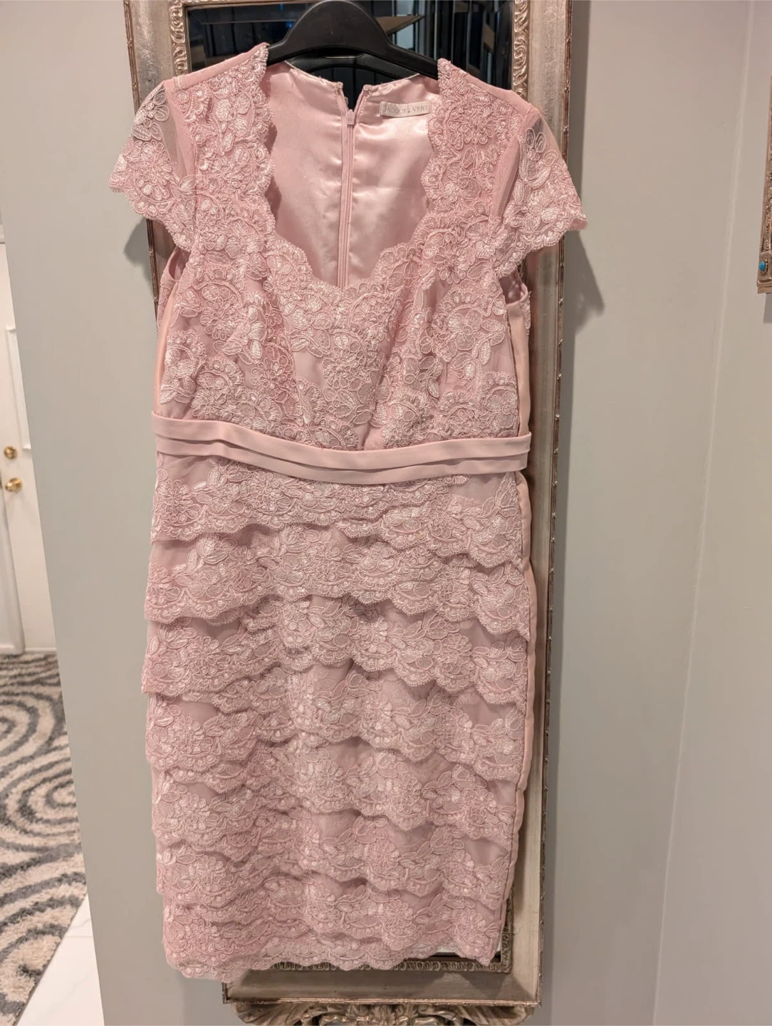 This Jacques Vert dress features delicate lace overlay and a satin lining. It has short sleeves and a satin belt with a bow accent at the back. Perfect for a special occasion!