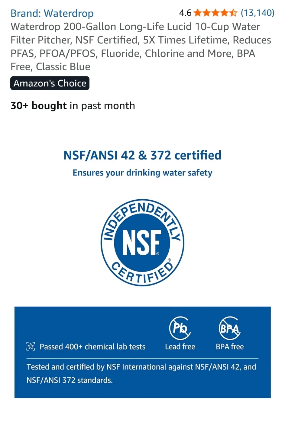 It's NSF certified for reducing contaminants. The pitcher has a clear body with a blue lid and handle.