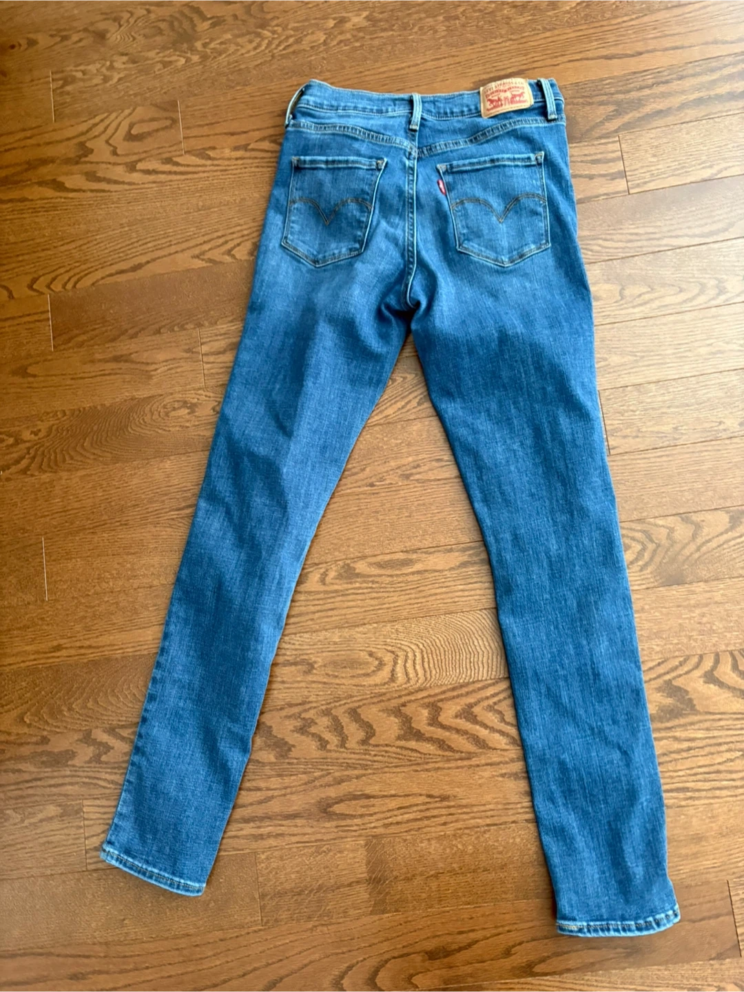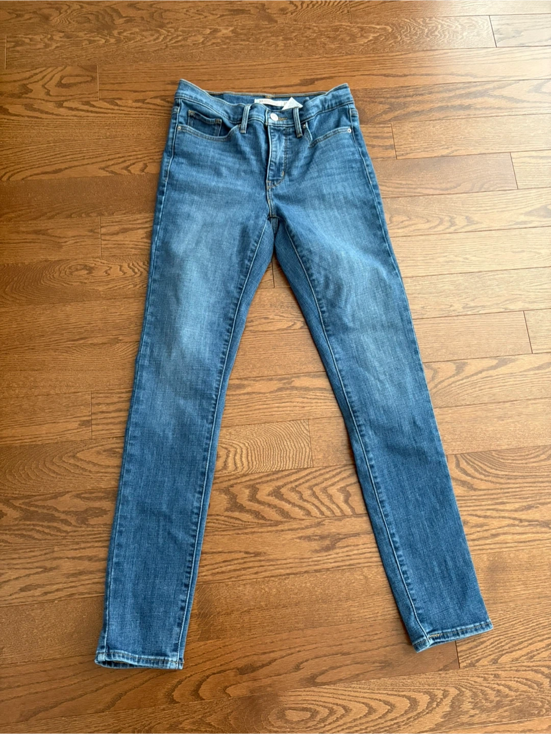 These are a pair of Levi's 311 Shaping Skinny jeans in a size 27. They're a blue denim wash. Made from a comfortable stretch fabric.