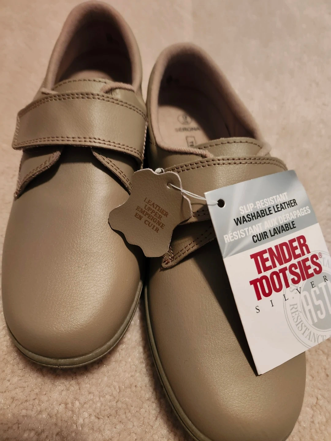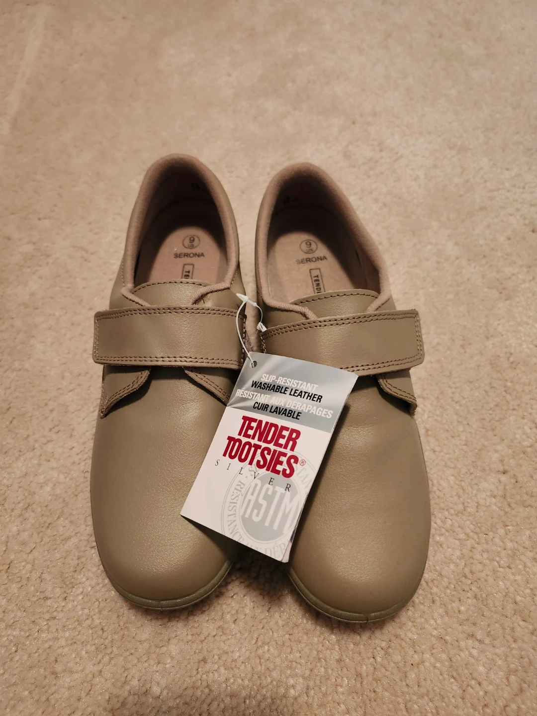 Slip-resistant and washable leather upper. These shoes are a size 9 and come in a taupe colour. They feature adjustable hook-and-loop straps for an easy fit. New condition!