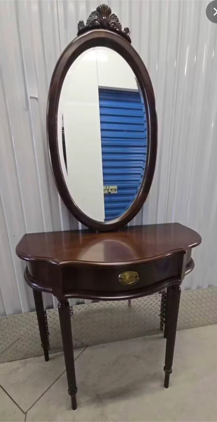 This elegant console table features a rich dark wood finish and an oval mirror with decorative detailing. It includes a single drawer with a brass pull for convenient storage. The table's legs have a classic turned design.