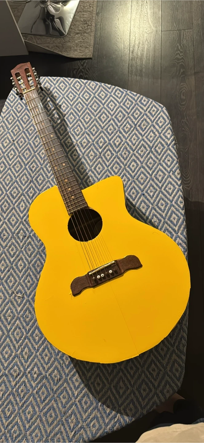 5Selling a vibrant yellow acoustic guitar! It's in used condition, as you can see in the photos. Perfect for someone looking for a unique instrument to play around with