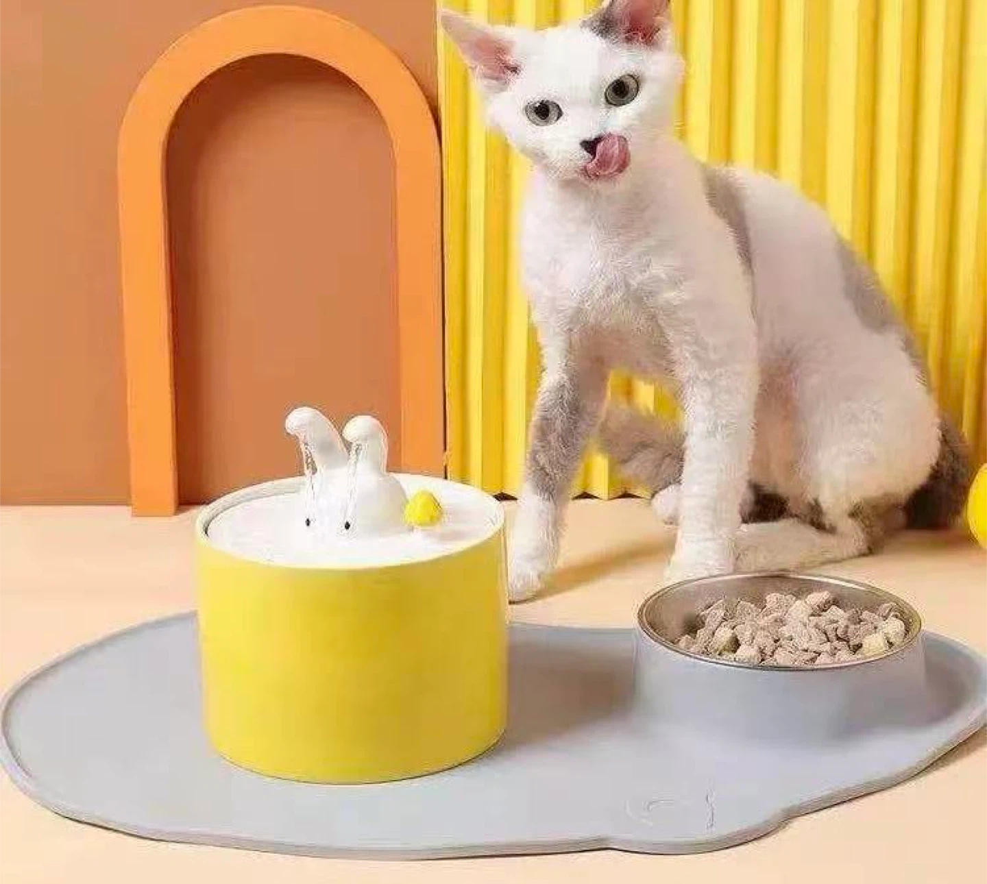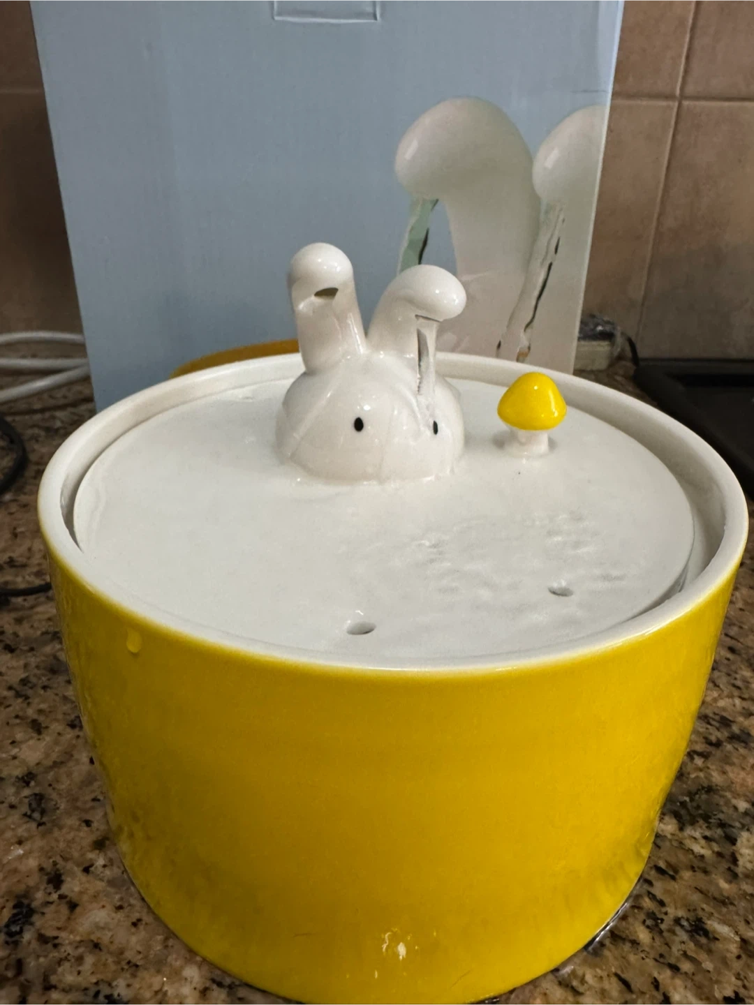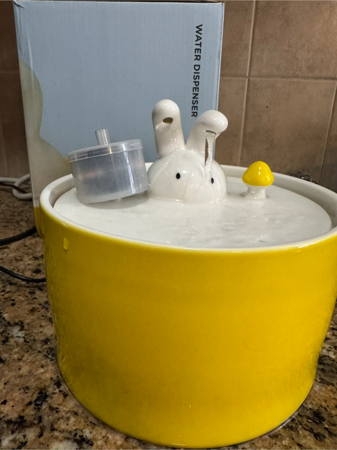 60BRAND NEW pet water dispenser. Come with 3 free filter!! Keep your furry friend hydrated with this adorable yellow ceramic pet water fountain! The design features a cute bunny and mushroom detail, encouraging your pet to drink more water. It's ready to find a new home!