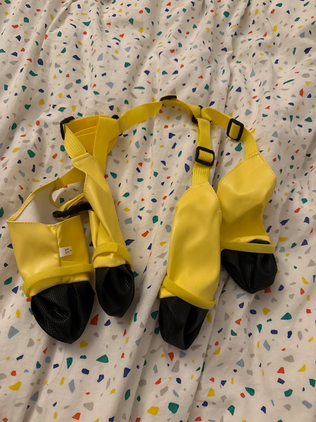 15These are a pair of yellow dog boots in size XS. They have black soles and adjustable straps. Great for protecting your furry friend's paws!