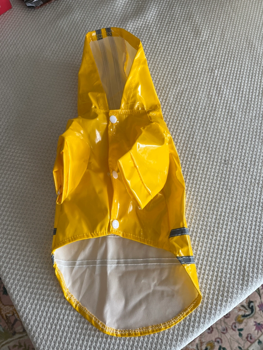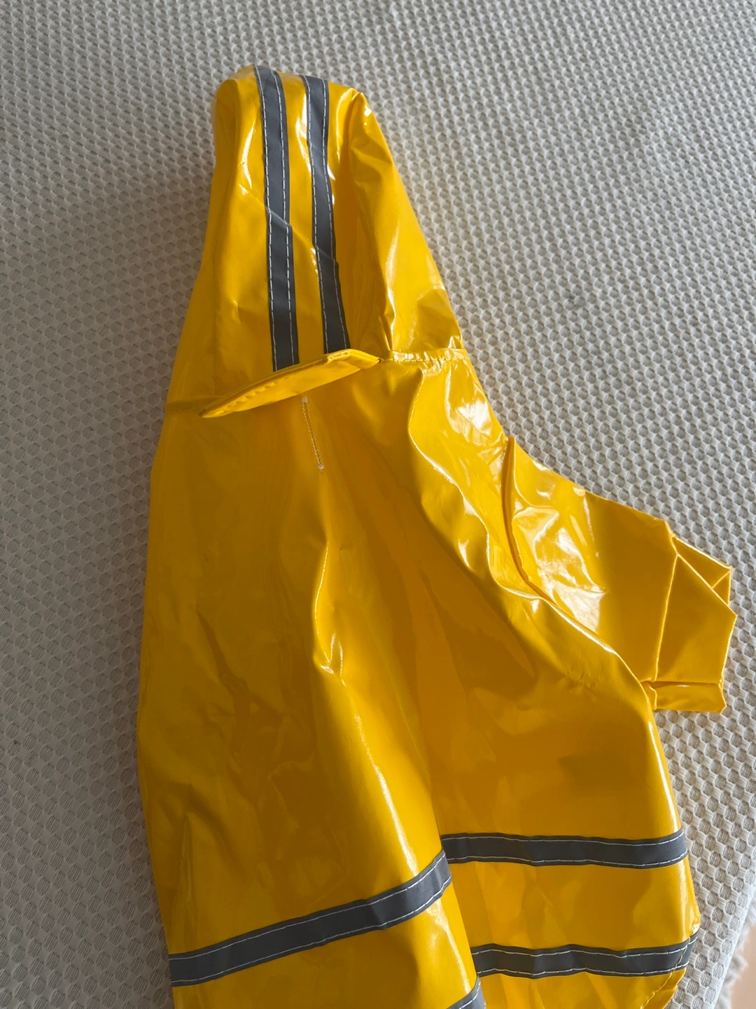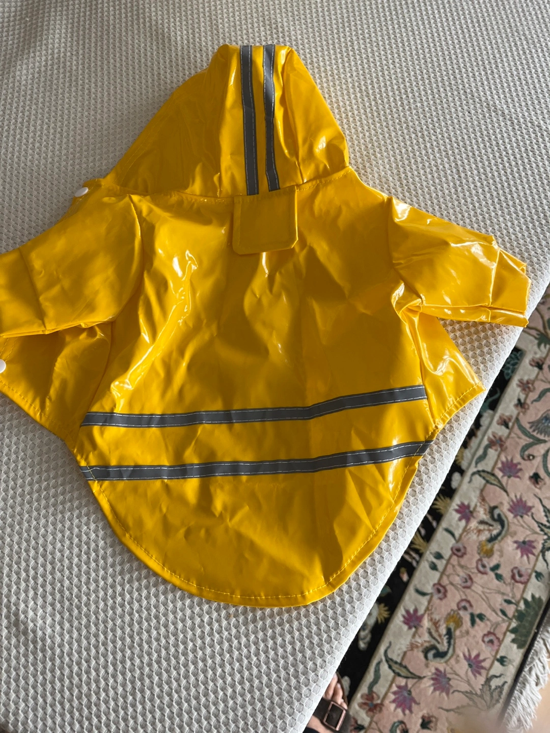 Yellow raincoat with reflective strips. Has a hood. Buttons up the front. For small dogs