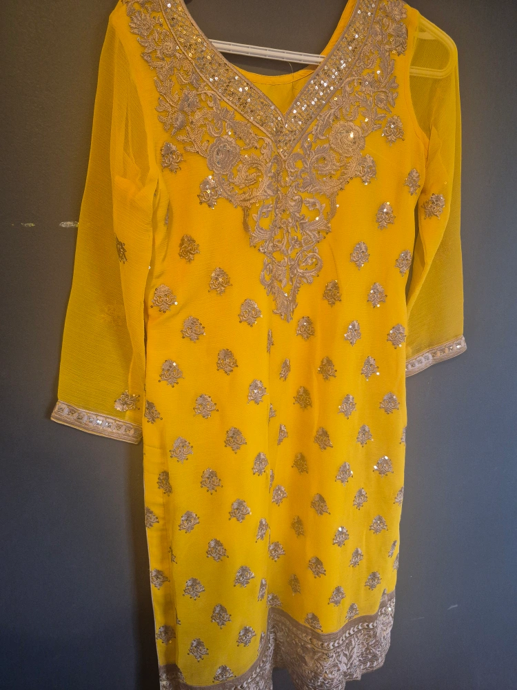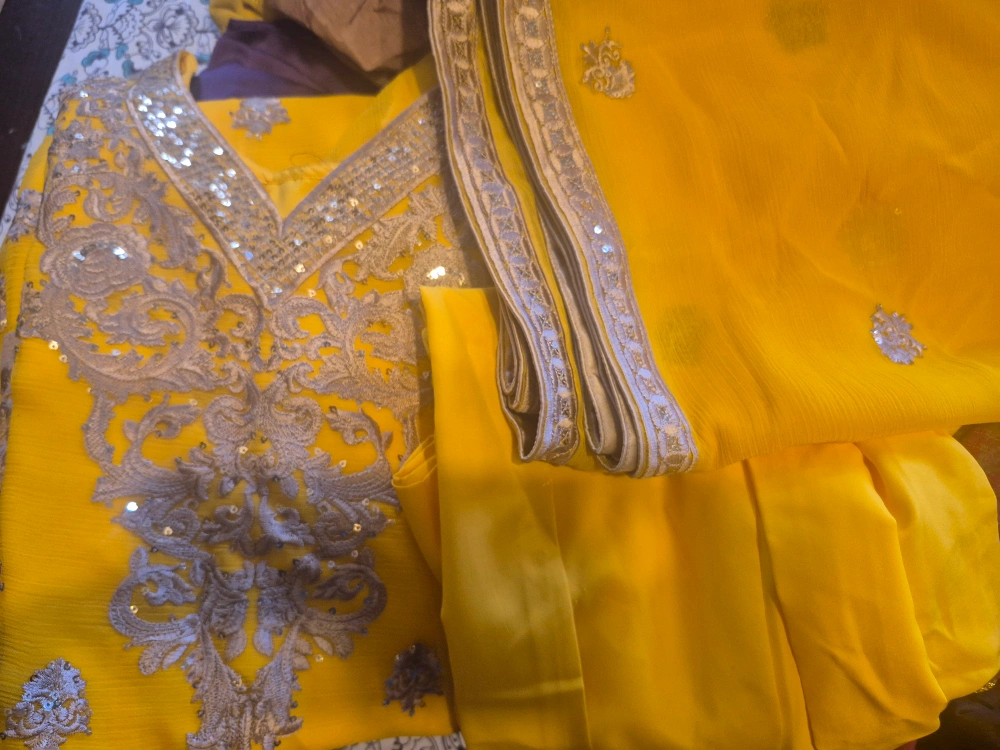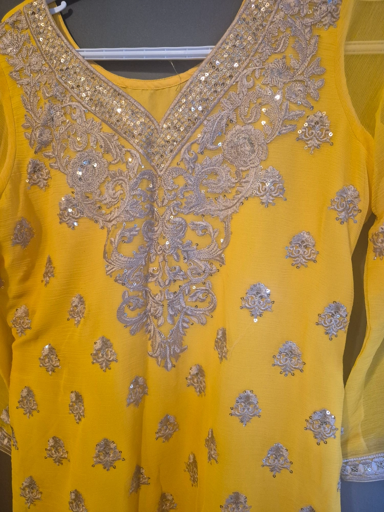 10Beautiful yellow salwar kameez with intricate silver embroidery. This outfit is perfect for a special occasion or celebration. The material feels lovely and light, making it comfortable to wear. It includes the kameez (tunic), salwar (pants), and dupatta (scarf).