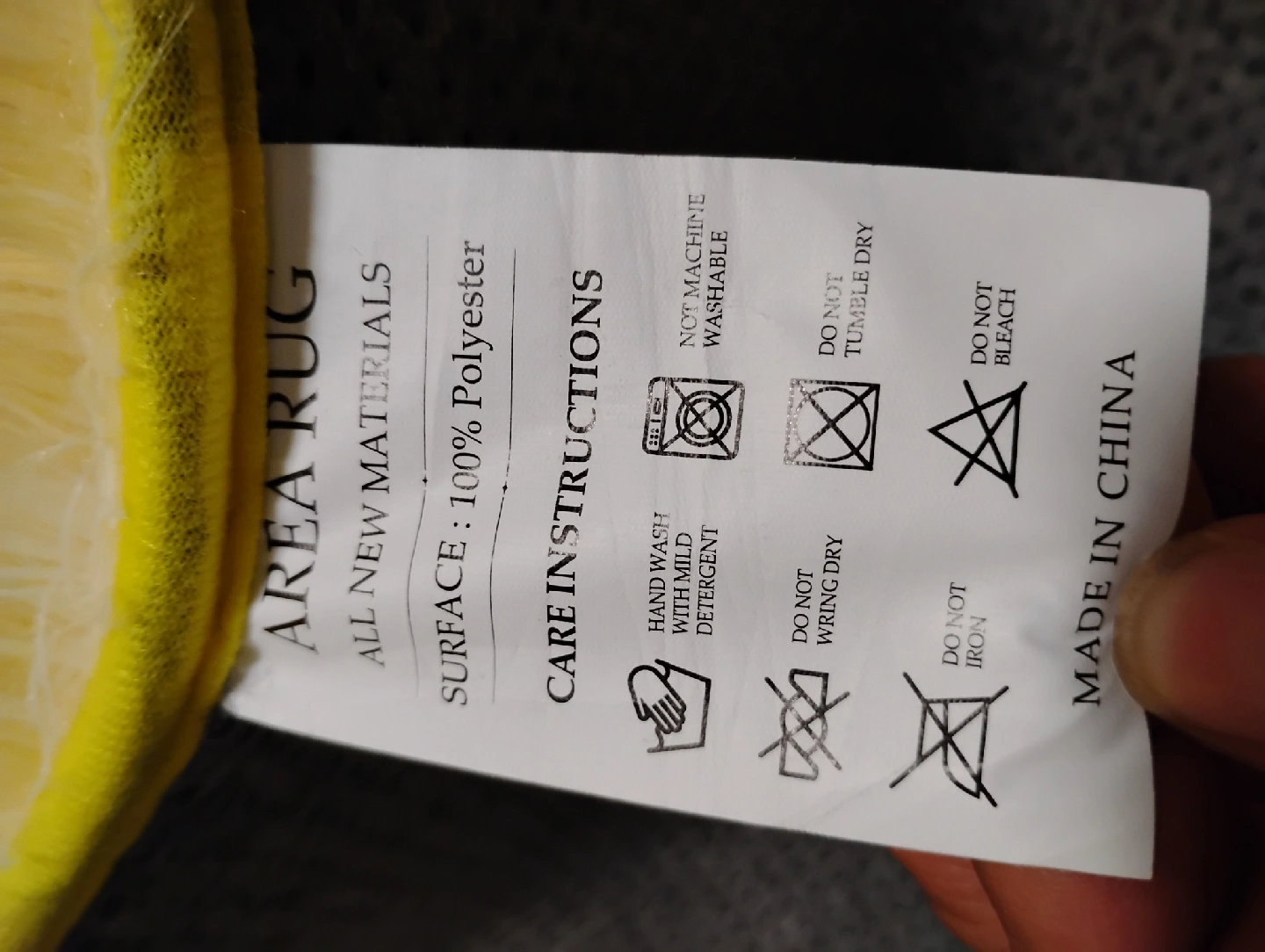 Selling a shag rug with a yellow and white fluffy top and a grey backing. It's in good condition and would be a cozy addition to any room!