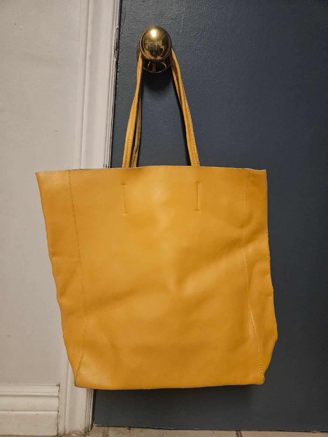 10A simple, stylish yellow leather tote bag! It's in great condition and ready for a new home. Perfect for carrying your everyday essentials, groceries, or books. The colour is a soft yellow, and the material is leather