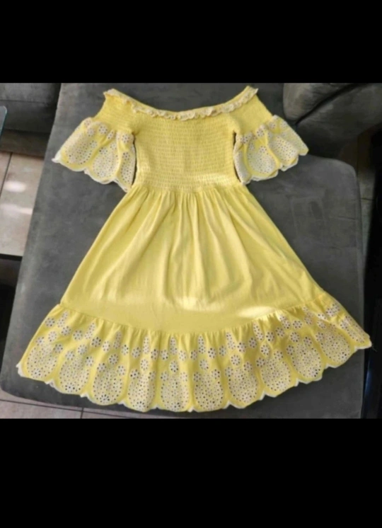 Selling a cute yellow dress with off-the-shoulder sleeves. It has a smocked bodice and eyelet detailing on the sleeves and hem. Size small for a 5'3 girl.
