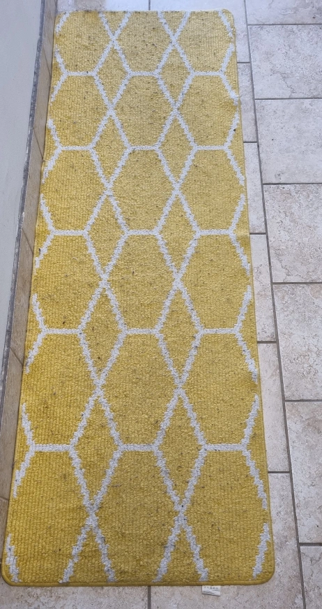 10Here's a nice yellow rug with a white geometric pattern. It's in good condition and would look great in any room of the house!