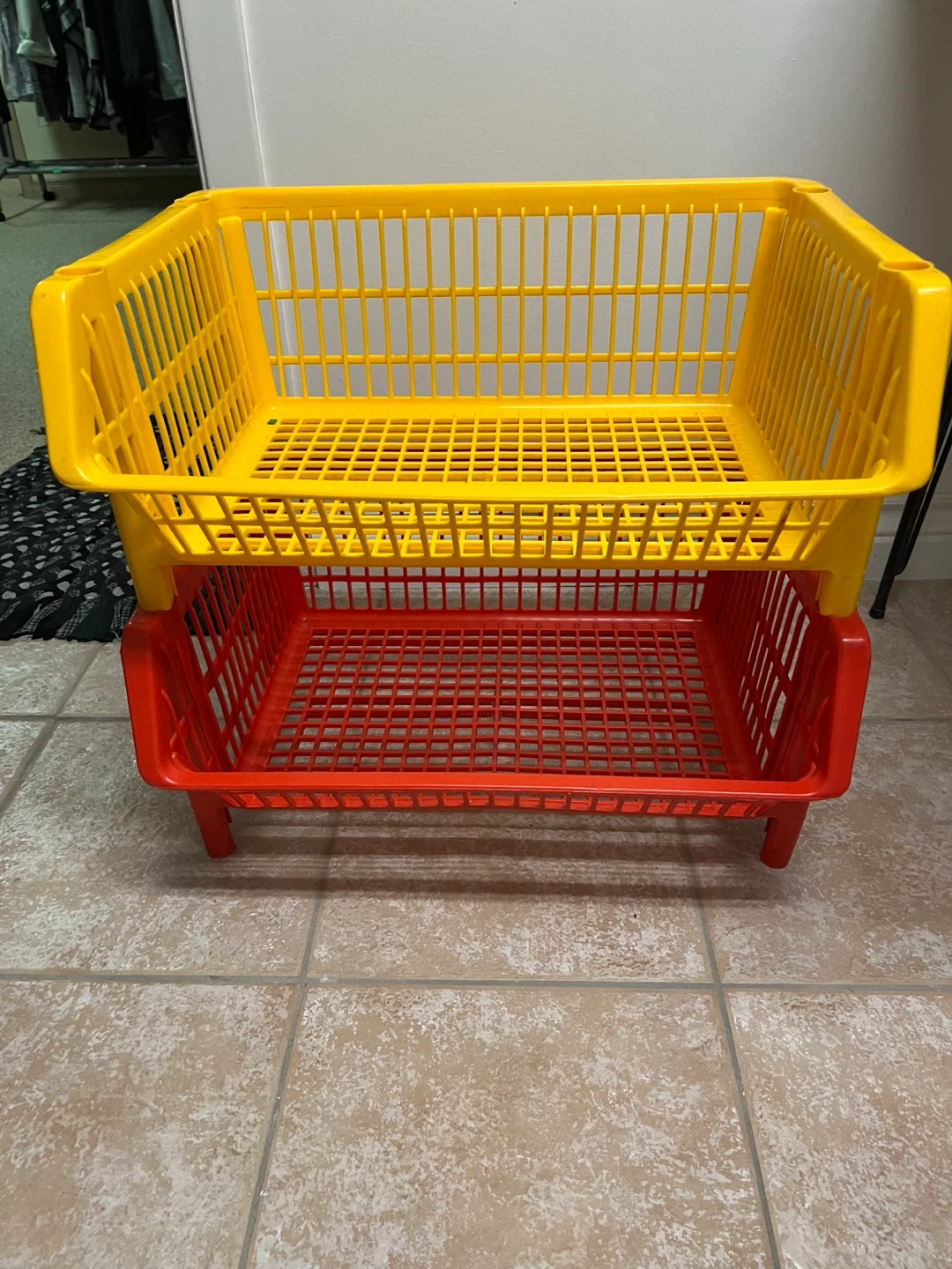 Two stackable plastic baskets, one yellow and one red. Great for organizing toys, crafts, or anything else you need to store!