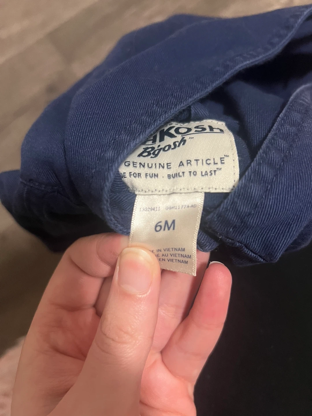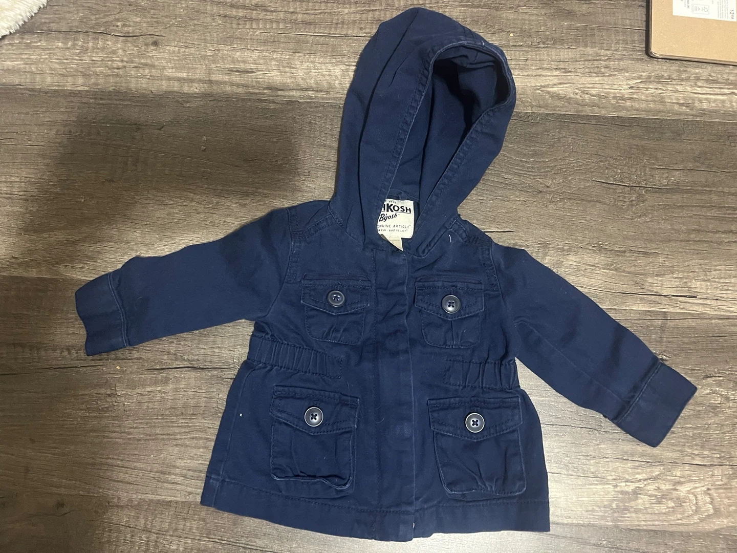 OshKosh B'gosh navy blue jacket with a hood. Genuine article, built to last. Size 6 months.