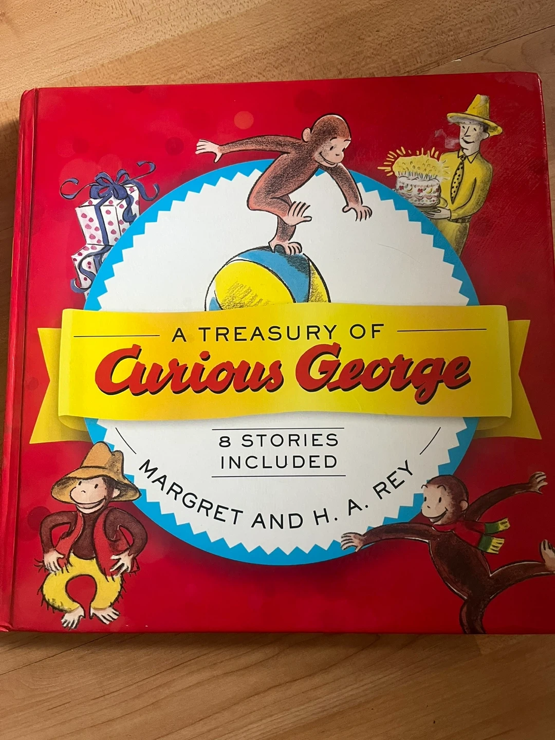This is a treasury book featuring 8 timeless stories about Curious George by Margret and H.A. Rey. It includes titles like 'Curious George Takes a Train' and 'Curious George Goes Camping'. Young readers will enjoy the adventures of this beloved monkey character.