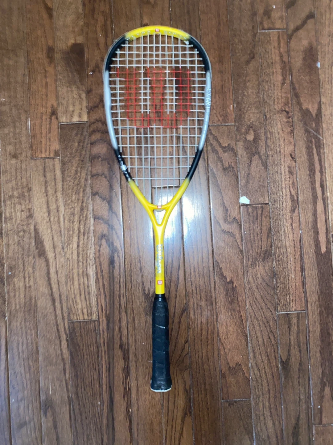 Wilson Titanium Series squash racquet. Yellow and black frame with a black grip. Comes with a protective cover. Grip is old and weathered. Could use a regripping.