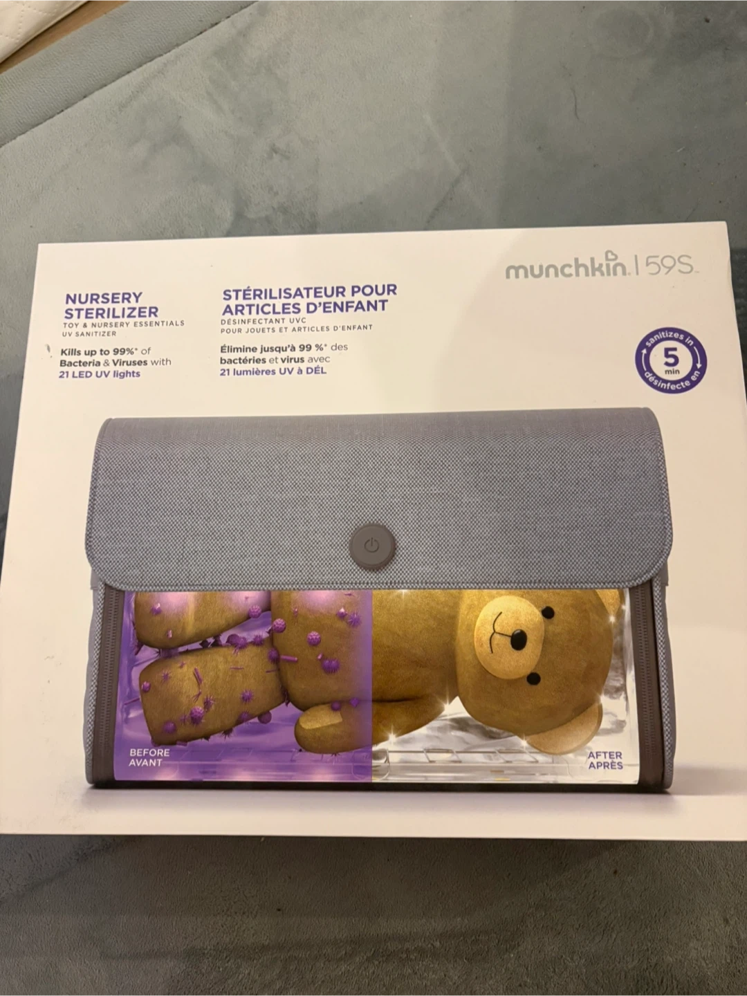 This Munchkin 59S nursery sterilizer disinfects baby essentials using 21 LED UV lights. It kills up to 99% of bacteria and viruses in just 5 minutes. It's rechargeable via USB and comes with a pouch for sanitizing on the go.
